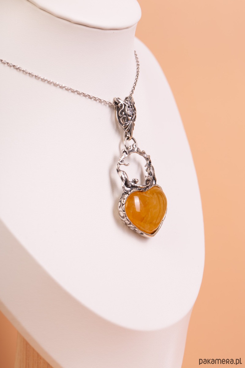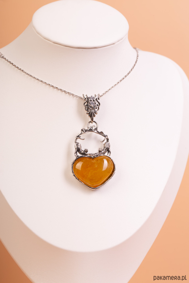 Uroczy, ręcznie wykonany wisiorek ze srebra próby 925, łączący jubilerską precyzję z ciepłym blaskiem naturalnego bursztynu bałtyckiego. Centralnym punktem projektu jest bursztyn o miodowym odcieniu, oszlifowany w kształt pełnego serca. Nad nim, w ozdobnej, ażurowej ramie, umieszczono dwie misternie wyrzeźbione postacie kotków. Całość wieńczy dekoracyjna krawatka wysadzana lśniącą cyrkonią, która dodaje biżuterii subtelnego blasku.