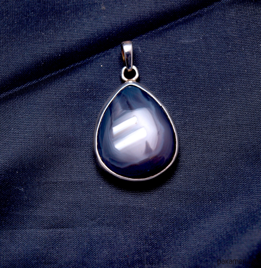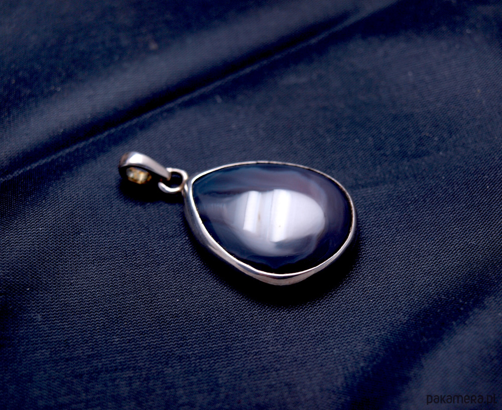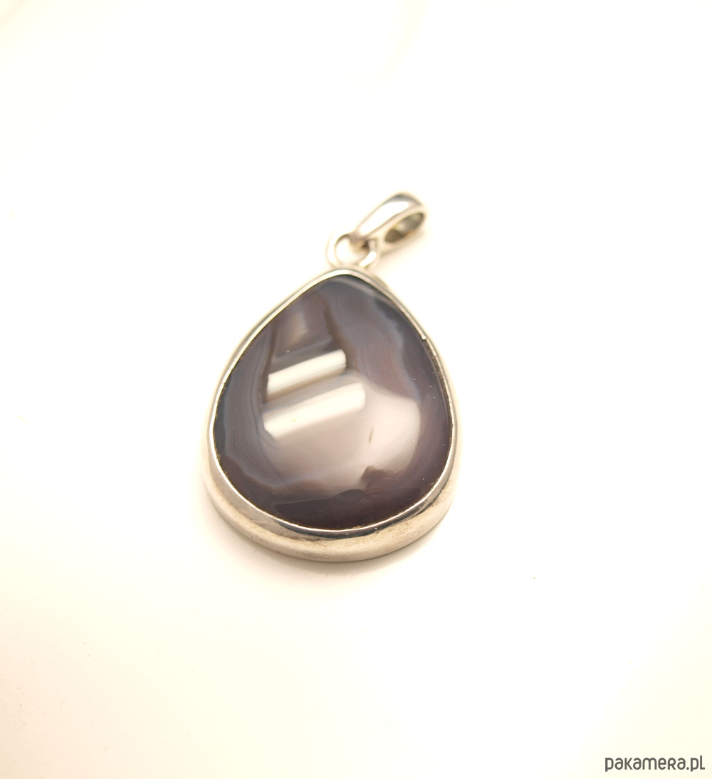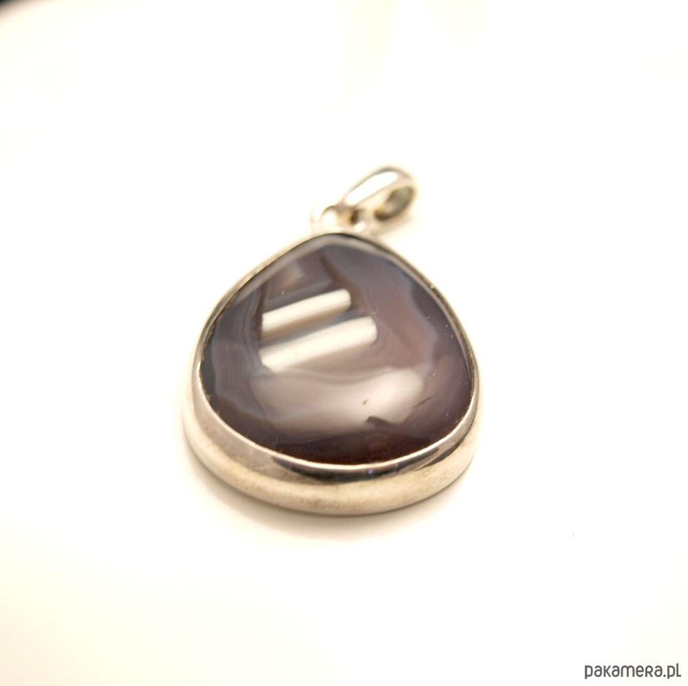 Ręcznie wykonany wisiorek z krzemienia i srebra próby 925. Całość oprawiono w delikatną, srebrną ramkę.