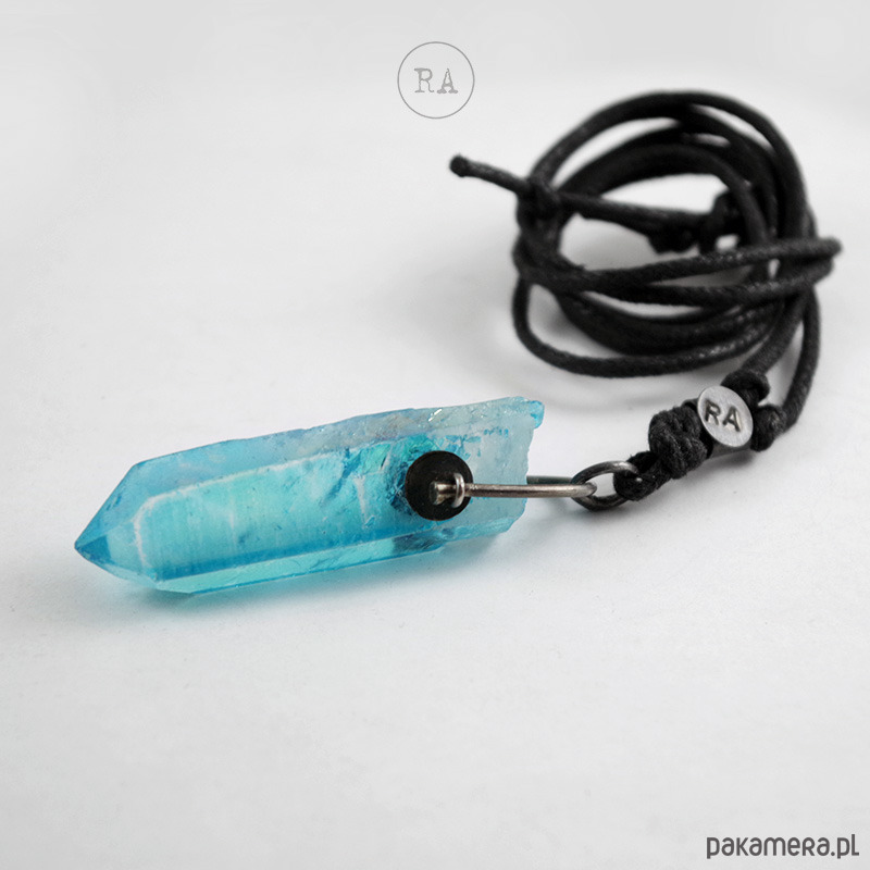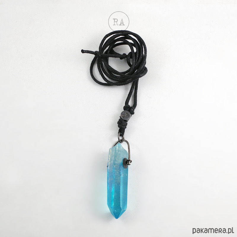 Naszyjnik z kryształem górskim "Aqua Aura" - niebieski kolor uzyskany dzięki pokryciu naturalnego kwarcu warstwą złota.