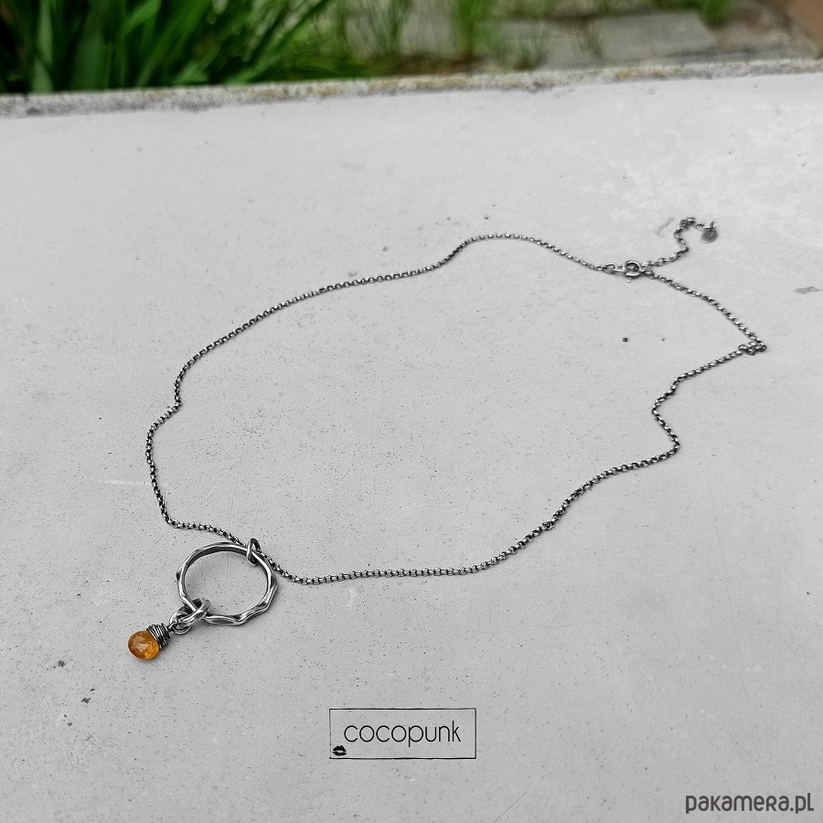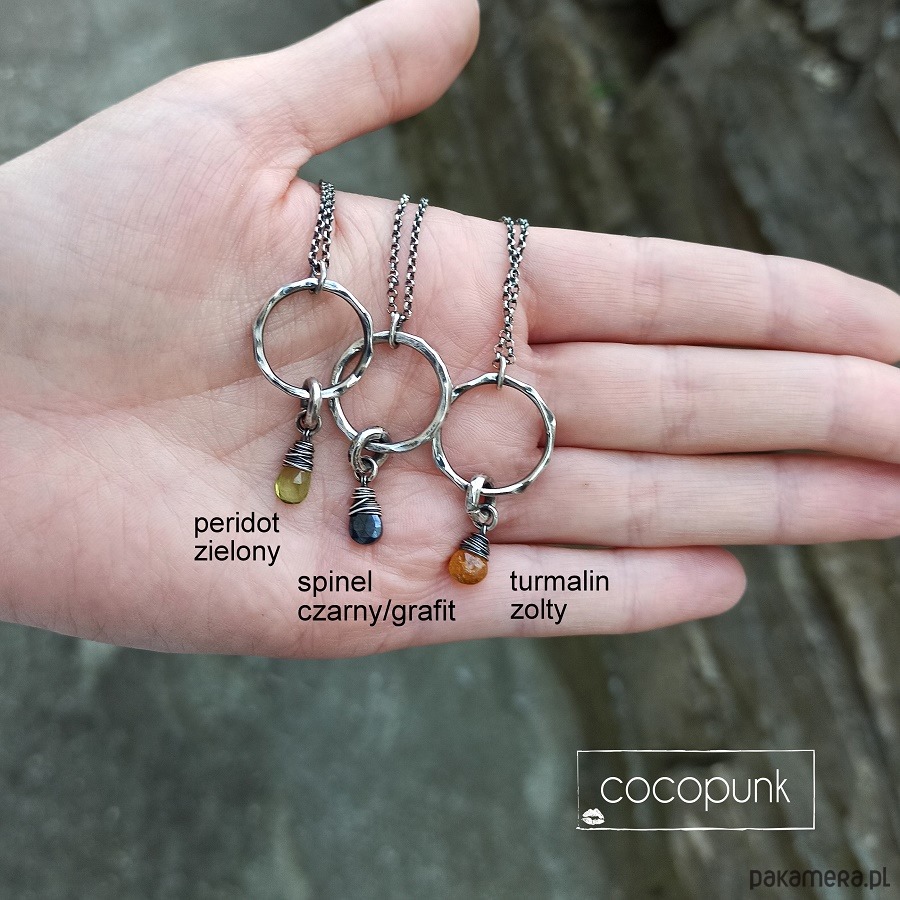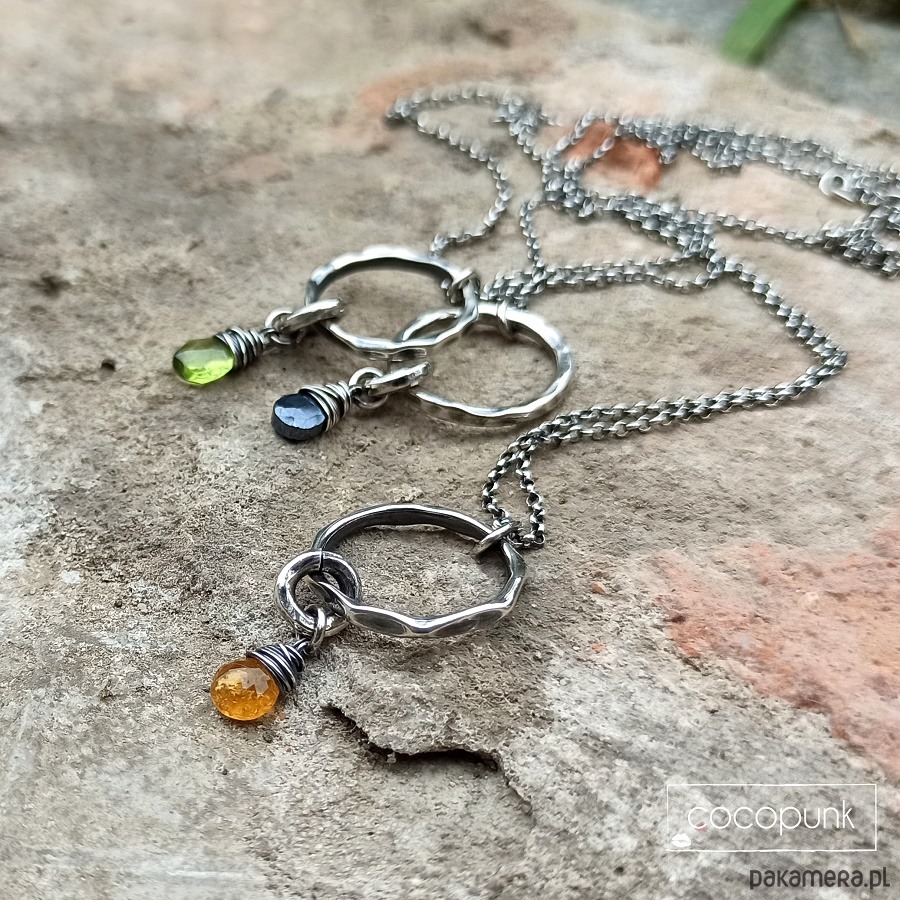 Nowoczesny i ciekawy naszyjnik wykonany w całości ze srebra pr. 925 ( młotkowanego, przyciemnianego, polerowanego). Zdobi go zawieszka w postaci kółka, grubego fakturowanego ogniwa oraz wybranego kamienia naturalnego: żółty turmalin, grafitowy spinel, zielony peridot. Wybrany kamień proszę napisać w komentarzu do zamówienia:) Parametry naszyjnika: wielkość zawieszki -3,5cm, długość łańcuszka- 45cm plus 5 cm łańcuszka regulacyjnego.