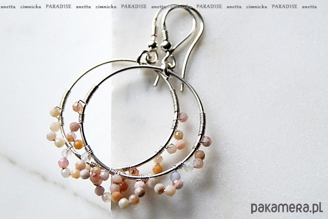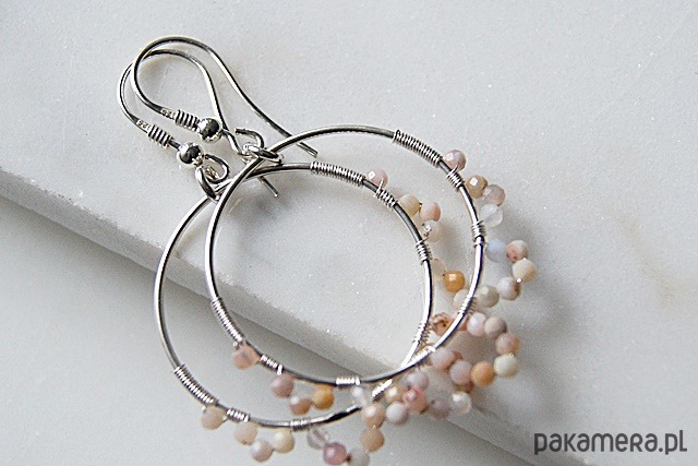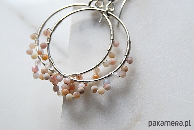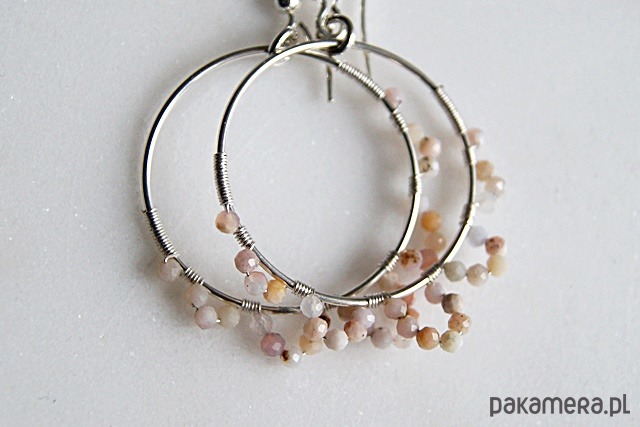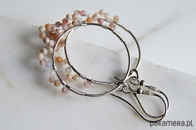Połyskujące, widoczne kolczyki wykonane ze srebra próby 925, 999, naturalnych fasetowanych peruwiańskich opali - zgaszony łososiowy róż, okazałych kutych obręczy śr. 30 mm.