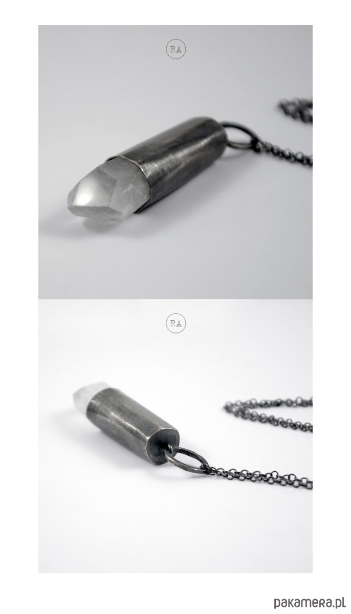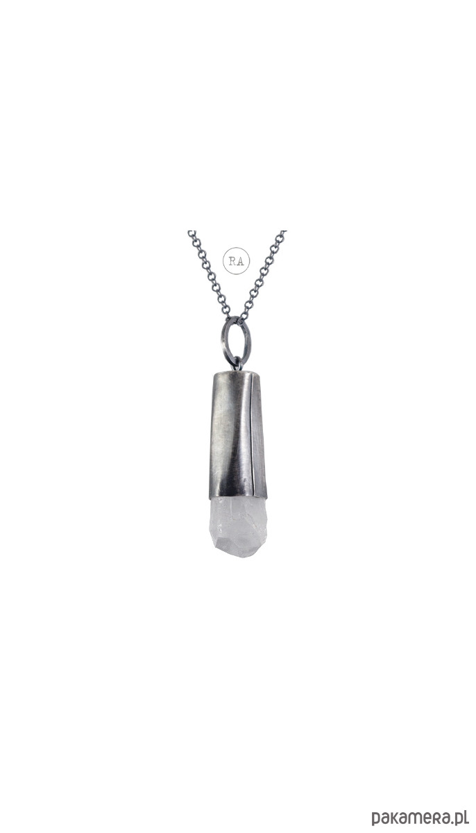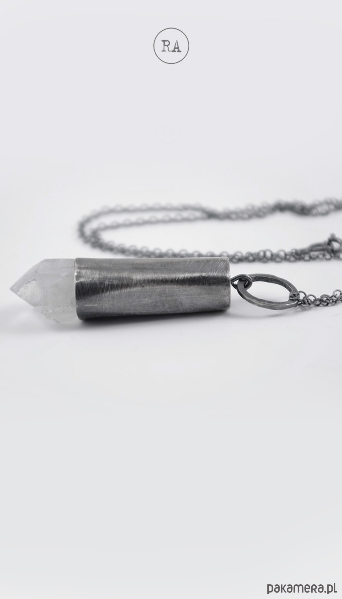 naszyjnik wykonany ręcznie, naturalny kryształ górski o nieregularnym kształcie, oprawa ze srebra,
