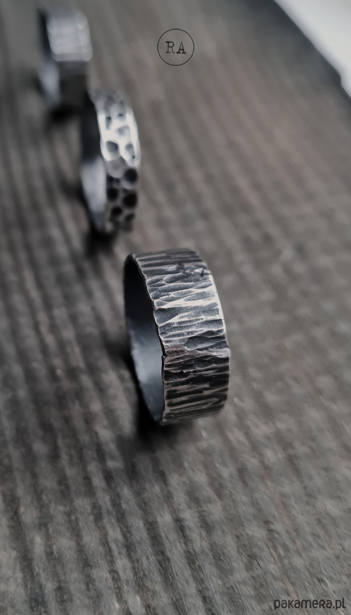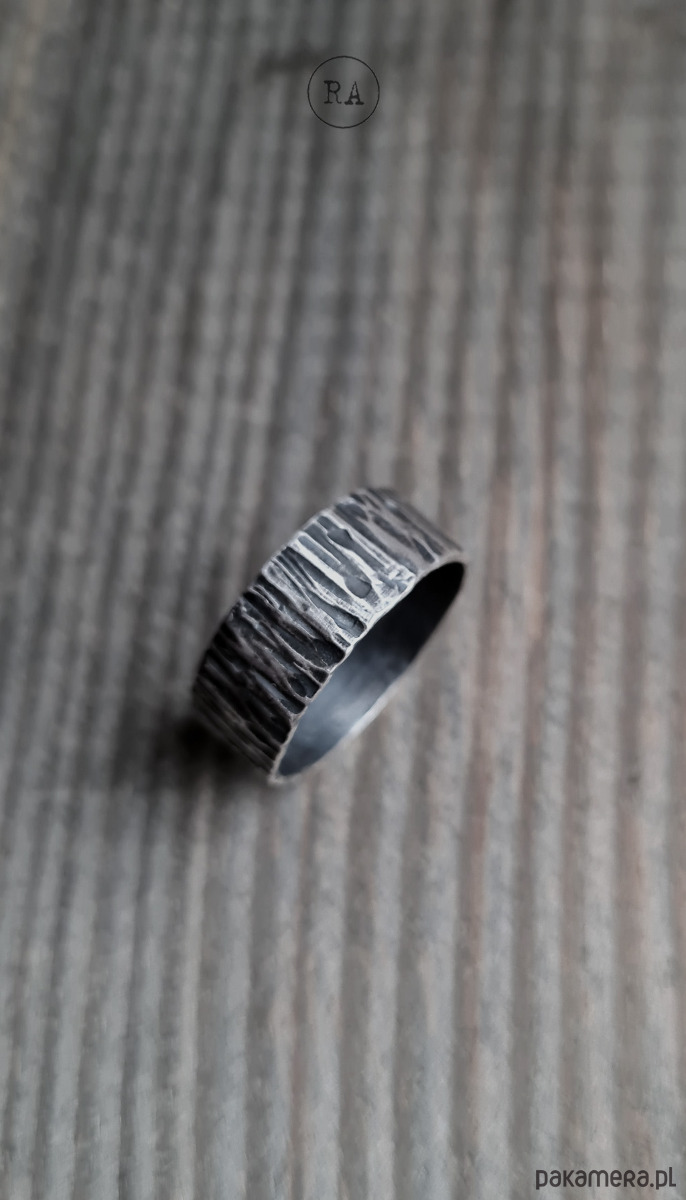 Obrączka wykonana ze srebra, fakturowana, oksydowana