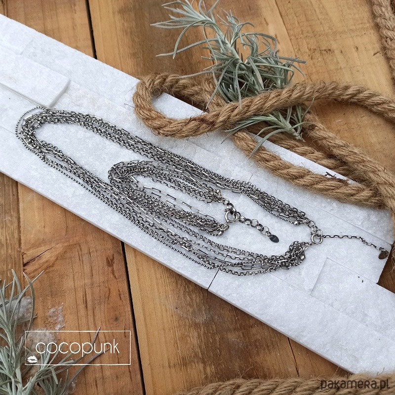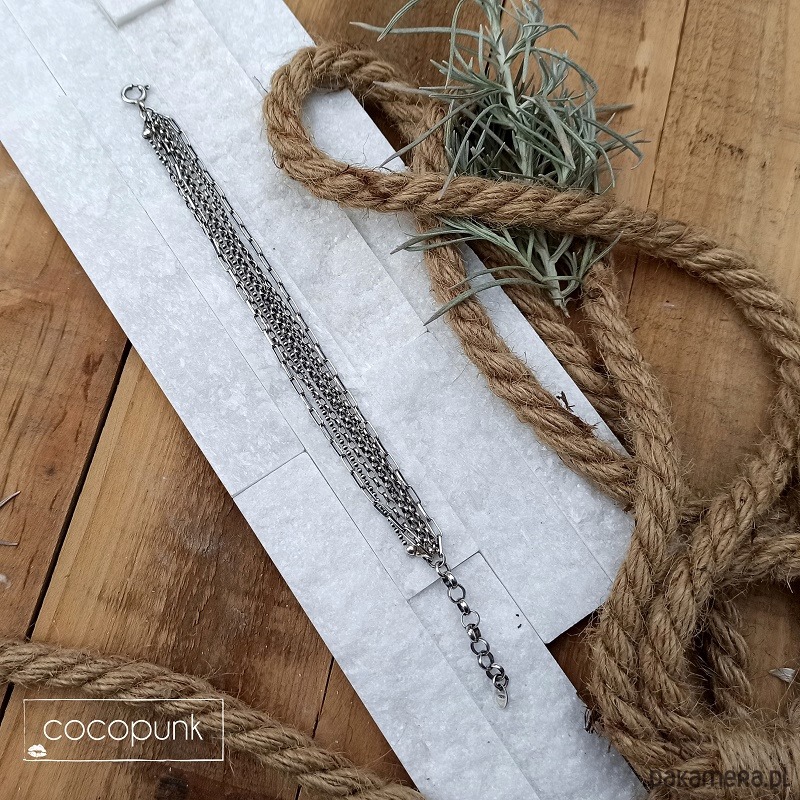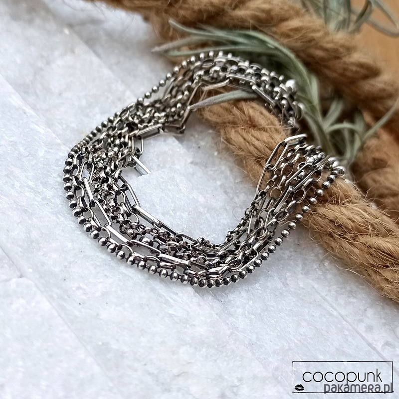 Nowoczesna bransoletka pasująca do wszystkich stylizacji. Chaotyczna, zadziorna, 100% srebro pr. 925 (przyciemniane i polerowane). Bransoletka składa się z 7 rzędów łańcuszków o różnej grubości i kształcie oczek. Długość bransoletki, łącznie z grubym łańcuszkiem regulacyjnym, wynosi 21cm, duże wygodne zapięcie. W ofercie posiadam naszyjnik do kompletu.