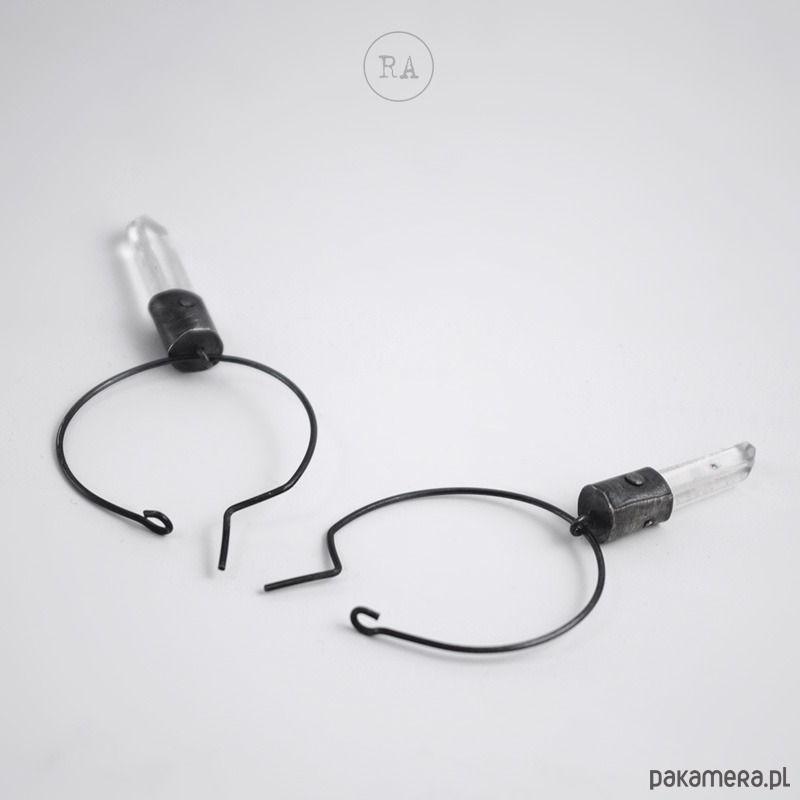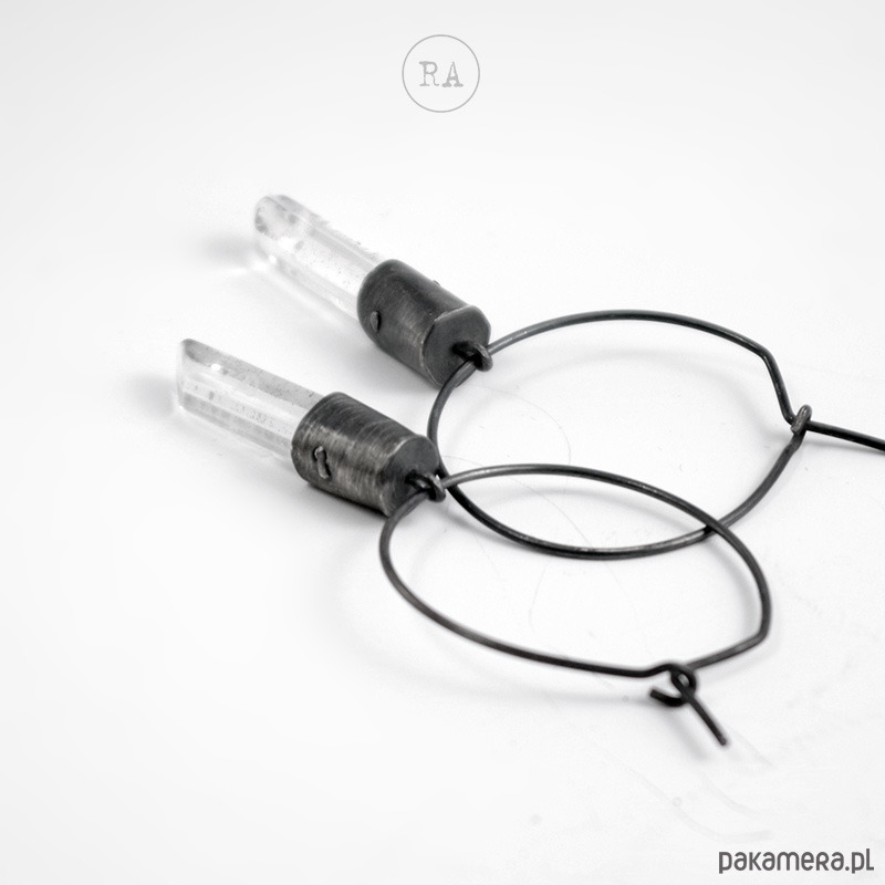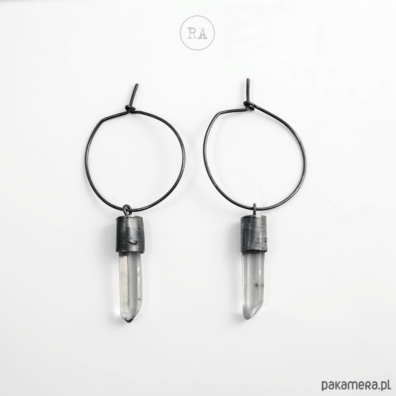 Srebrne długie kolczyki wykonane ręcznie, oksydowane, długość całkowita ok. 6 cm, zapinane "koła" ok. 3 cm. Naturalny kryształ górski.