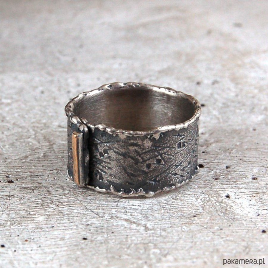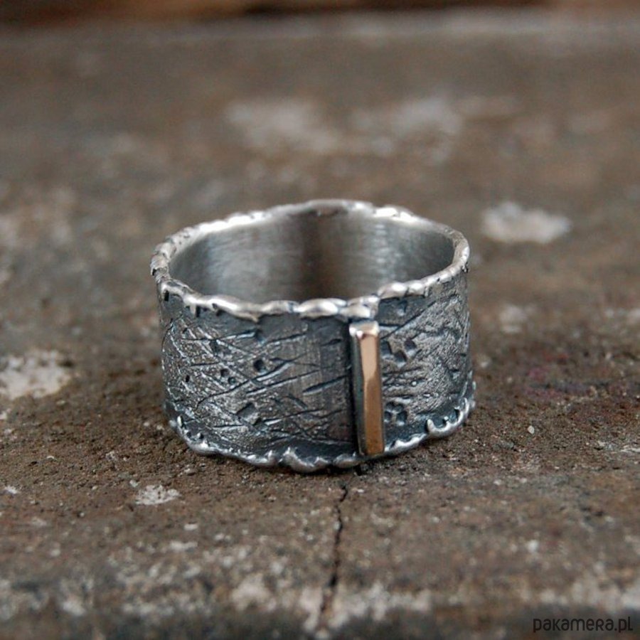 Obrączka ze srebra i złota. Złoto próby 585. Srebro surowe, oksydowane. Obrączka szerokości 1,2 cm. Proszę o podanie rozmiaru (maksymalny rozmiar 29).