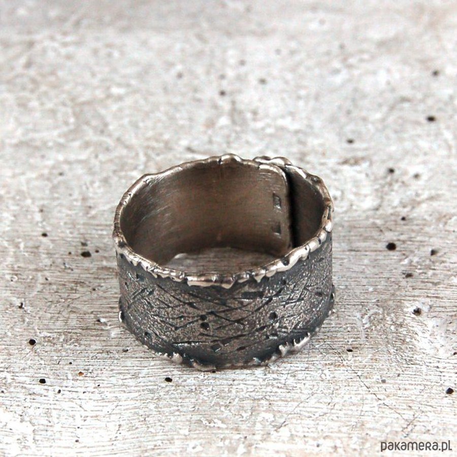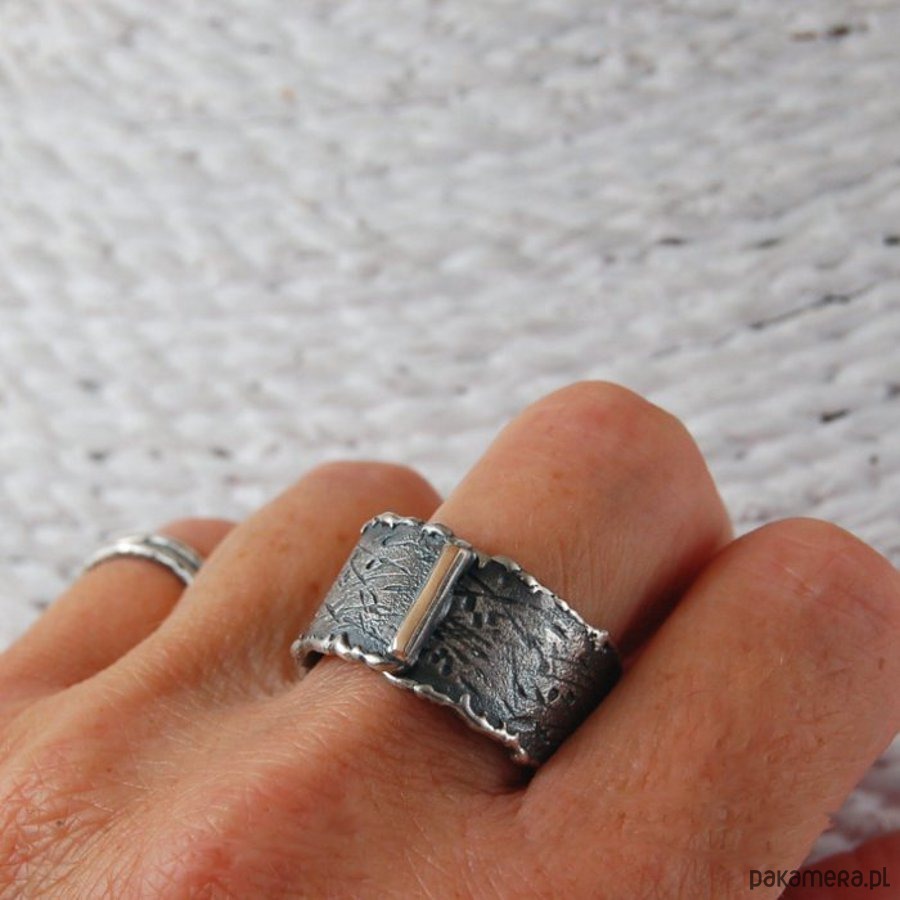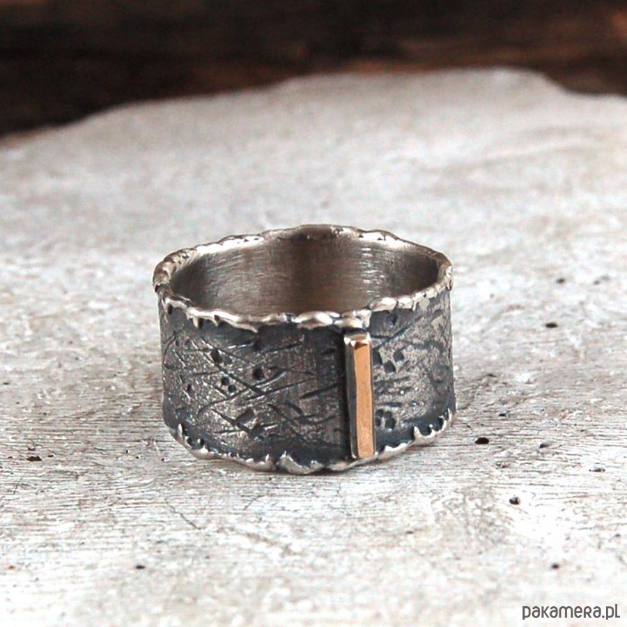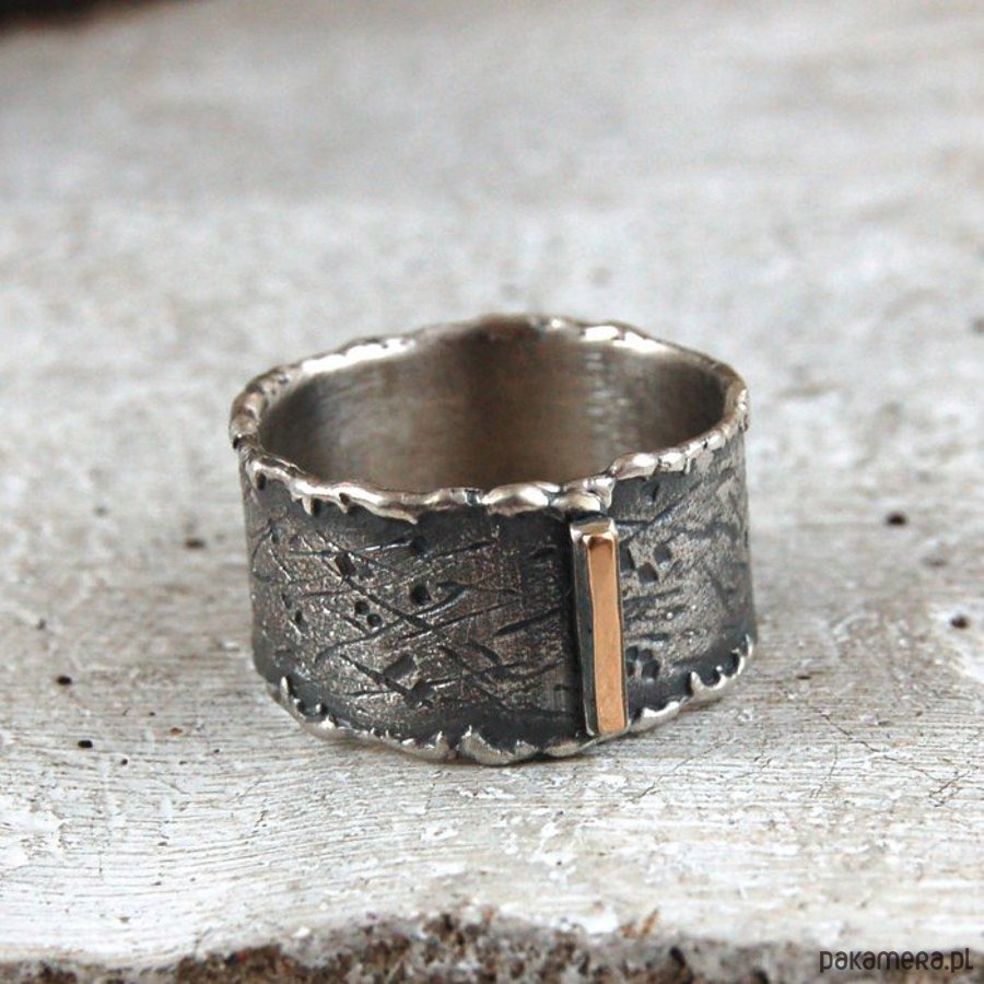 Obrączka ze srebra i złota. Złoto próby 585. Srebro surowe, oksydowane. Obrączka szerokości 1,2 cm. Proszę o podanie rozmiaru (maksymalny rozmiar 29).