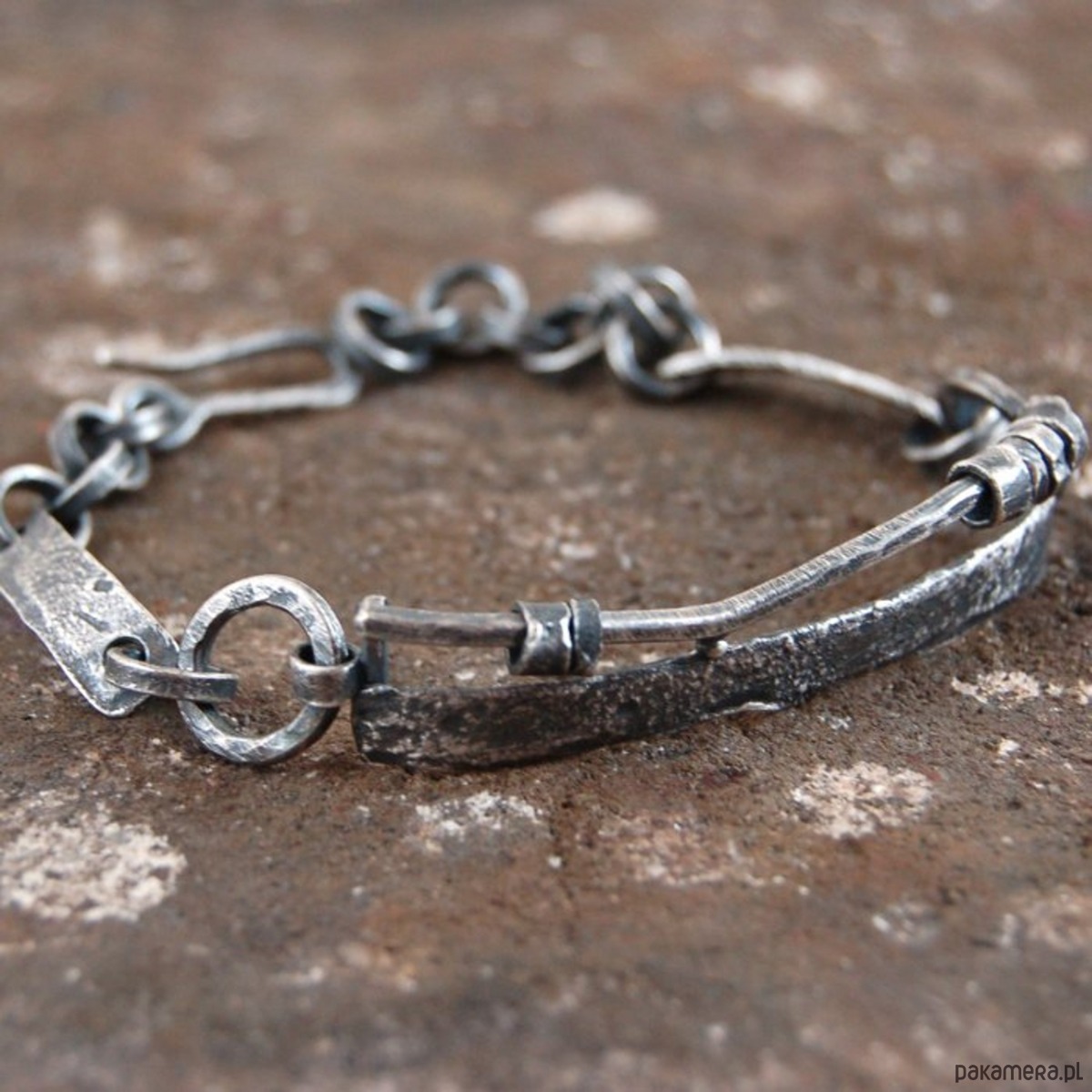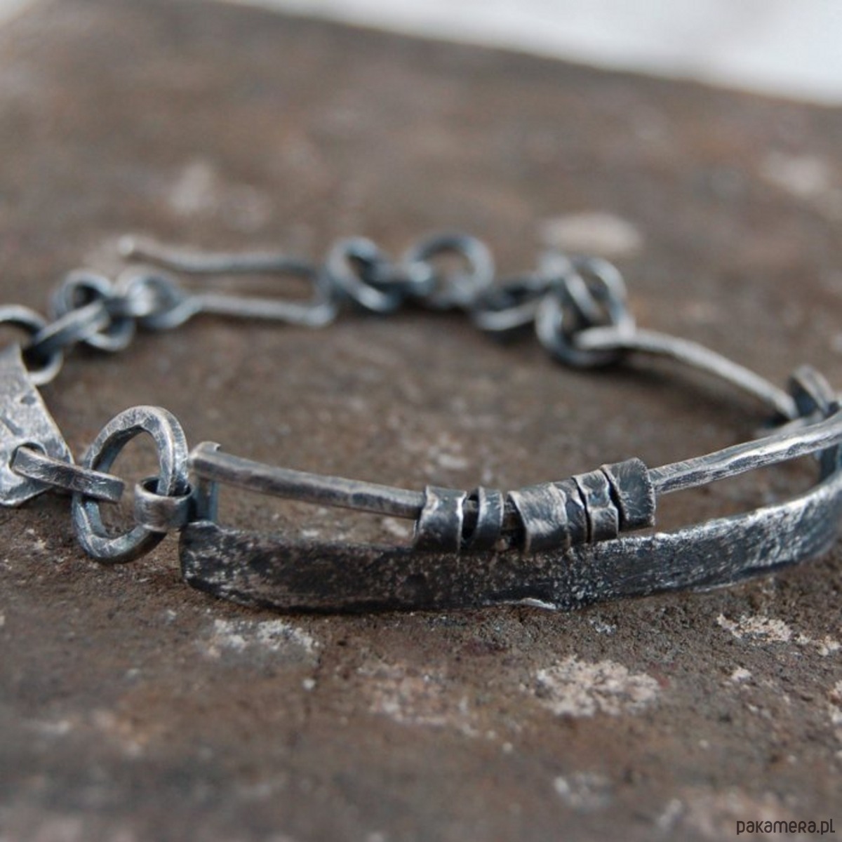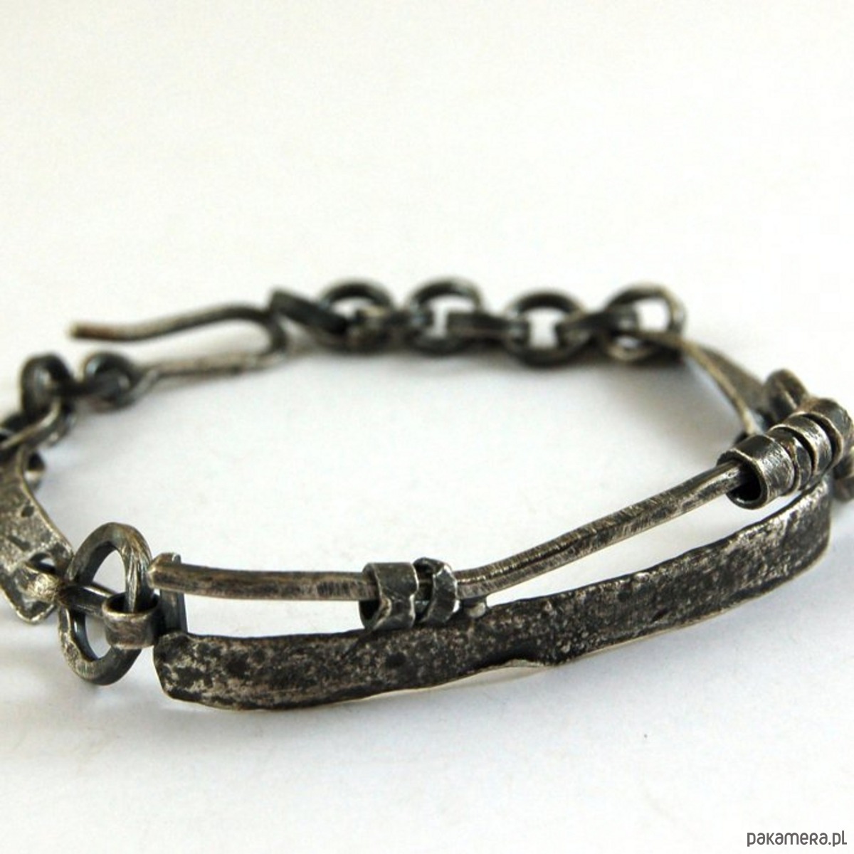 Bransoleta unisex z kutego, oksydowanego srebra. Wielkość centralnego elementu ok. 1 - 5 cm. Proszę o podanie obwodu nadgarstka.