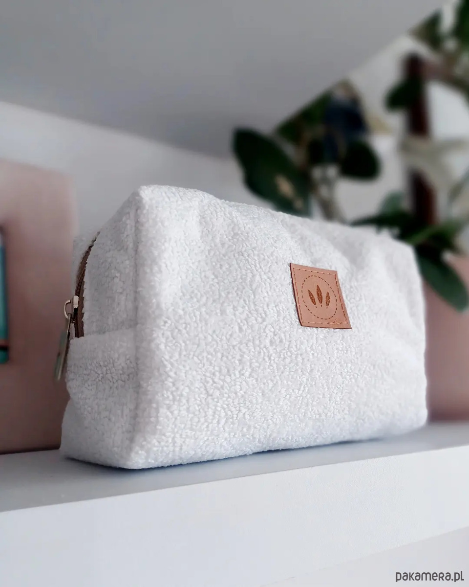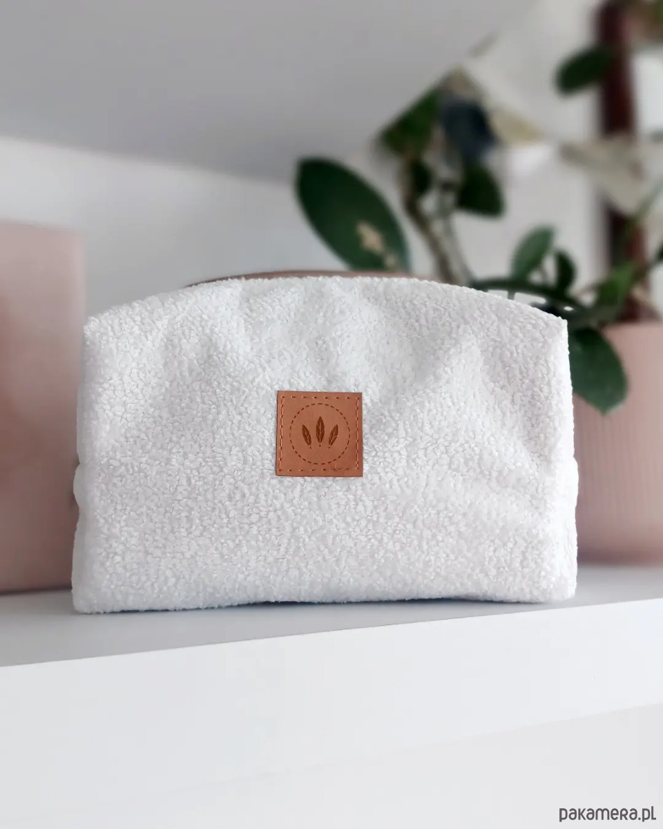 Średniej wielkości kosmetyczka z fantazyjnej tkaniny typu baranek.