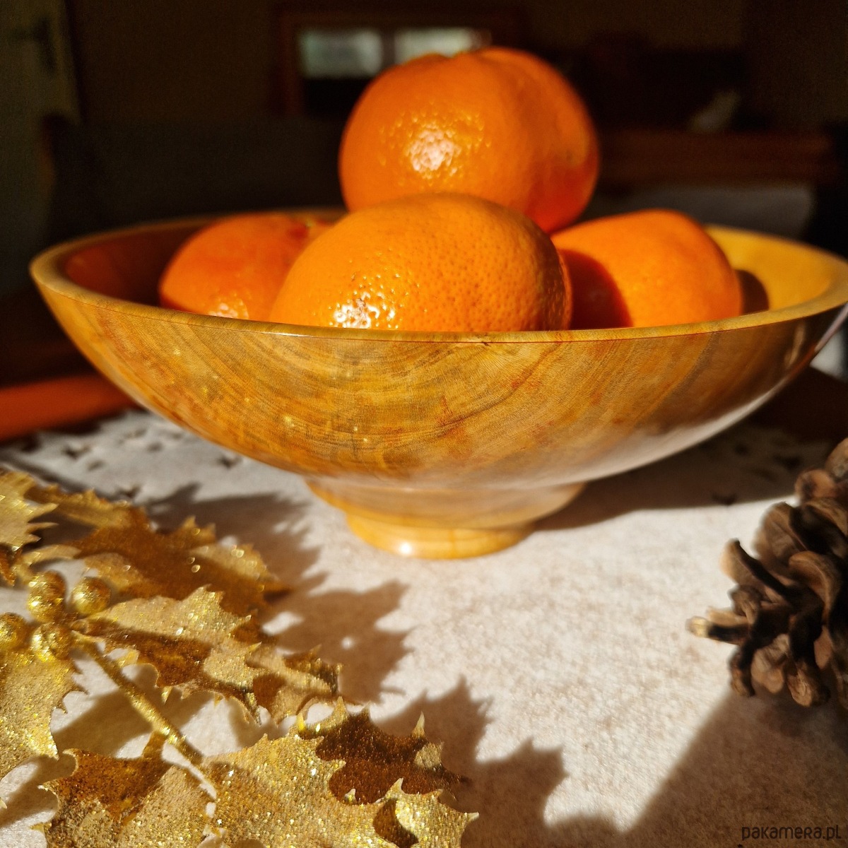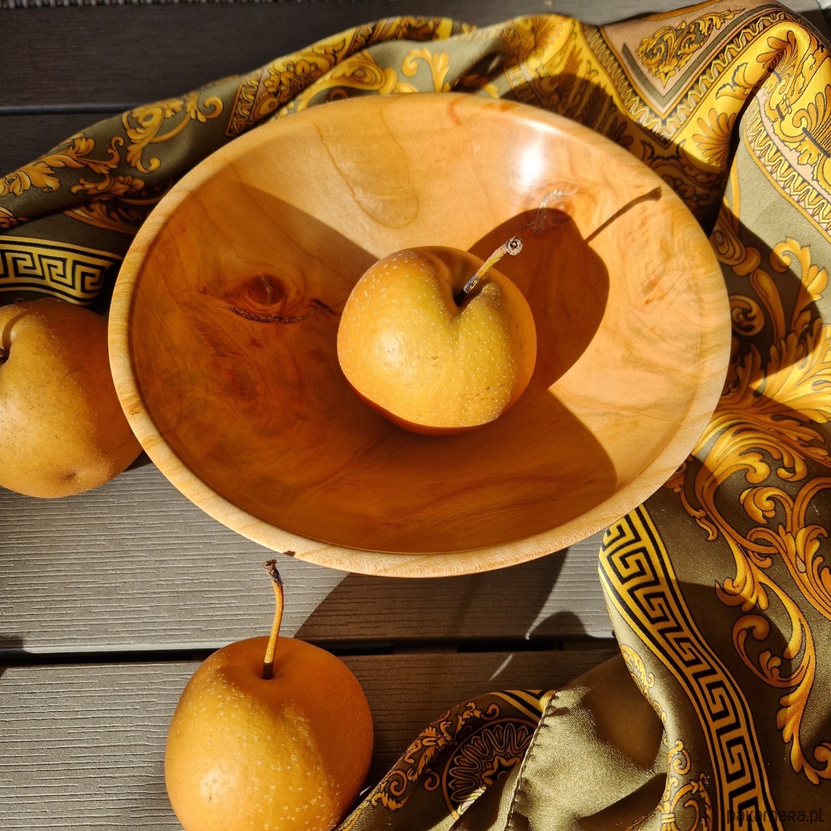 Cienka i lekka, a jednocześnie harmonijnie osadzona na delikatnej podstawie. Jej szeroka, otwarta forma oraz wykończenie do absolutnie jedwabiście gładkiej powierzchni celebrują prostotę i kunszt rzemiosła. Drewno jest zabezpieczone mieszanką oleju i wosku bezpieczną dla żywności, bardzo przyjemną w dotyku. Miska doskonale sprawdzi się zarówno w codziennym użytkowaniu, jak i jako element dekoracyjny. Idealna na soczyste owoce, delikatne wypieki, kuszące czekoladki lub jako ozdoba stołu, wypełniona pachnącym potpourri bądź artystycznie ułożonymi suszonymi kwiatami.