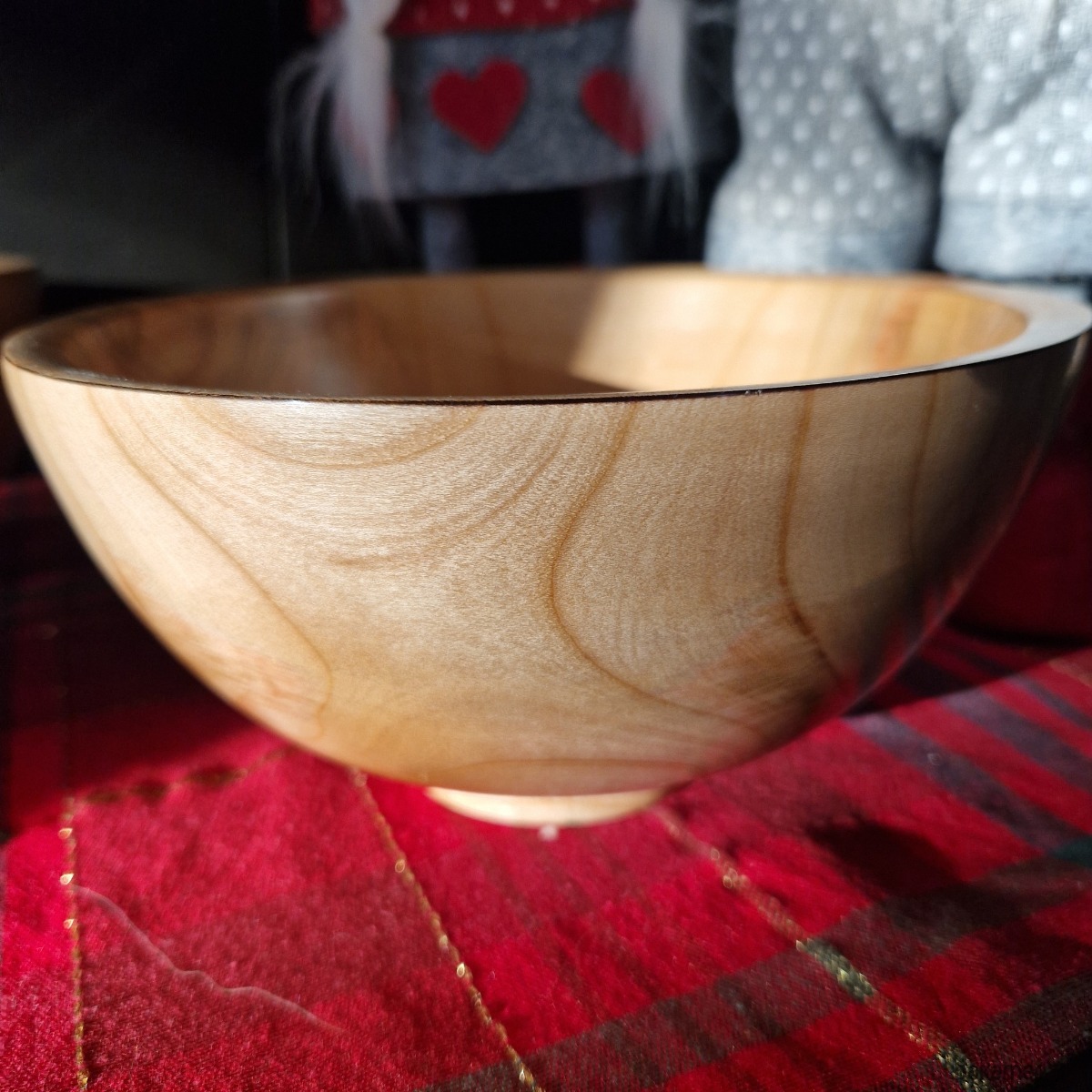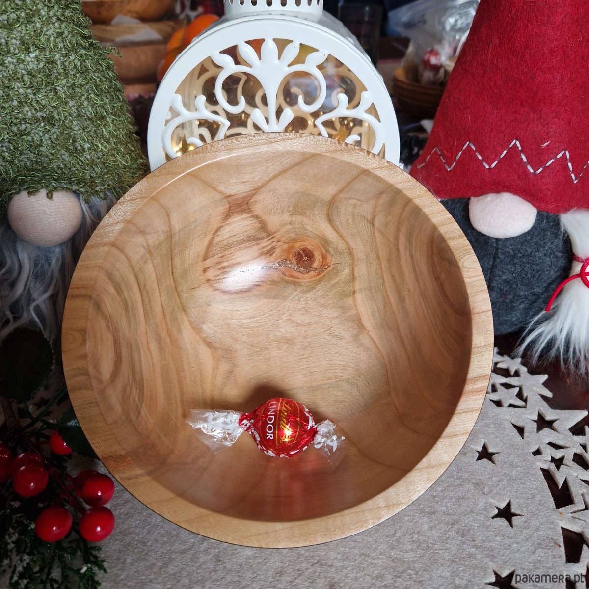 Misa została wykończona do jedwabiście gładkiej powierzchni i zabezpieczona mieszanką oleju i wosku bezpieczną dla żywności, dzięki czemu nadaje się zarówno do codziennego użytku, jak i do ekspozycji. Jej solidna forma sprawia, że doskonale nadaje się na drobne owoce, przekąski czy popcorn, a także jako element dekoracyjny wypełniony potpourri lub suszonymi kwiatami. Szczególnie pięknie prezentuje się ustawiona na stole jadalnianym, wyspie kuchennej, komodzie, lub otwartej półce, gdzie można w pełni docenić jej ciepło i fakturę.