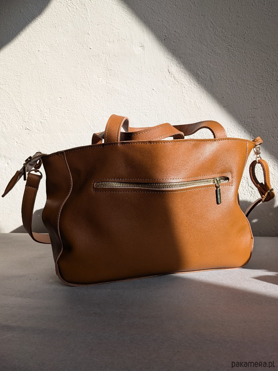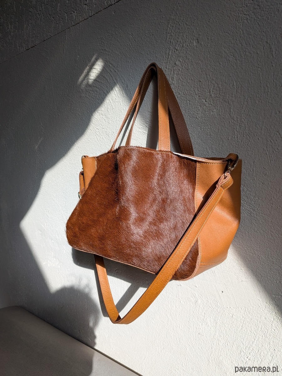 Piękna skórzana torba w kolorze brązowo - koniakowym. To jest skóra naturalna, gładka połączona ze skórą z włosem.