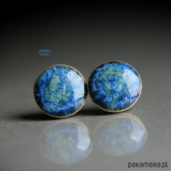 Okrągłe, lekko nieregularne ceramiczne kolczyki w formie sztyftów, ręcznie wykonane z delikatnej kamionki, jednostronnie szkliwione mieszanką błękitnych szkliw z efektem plamek i subtelnym połyskiem, na antyalergicznych sztyftach w kolorze srebrnym. Średnica ok. 11mm.Polecam