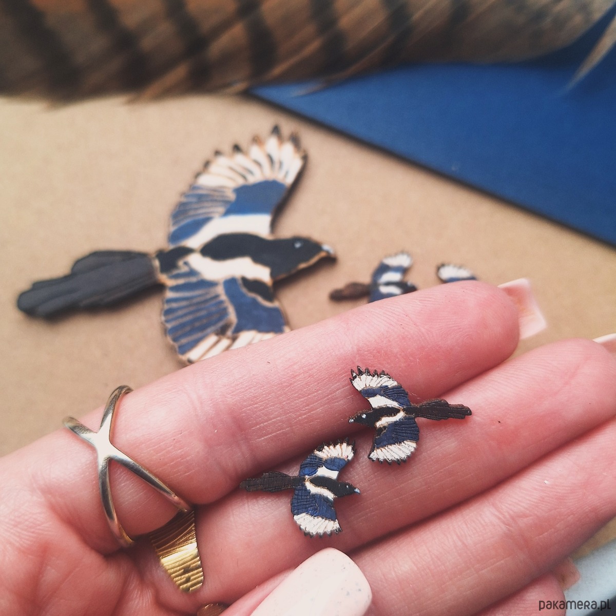 Lekkie kolczyki-sztyfty wykonane na podstawie autorskiego rysunku. Zrobione z drewna, ręcznie malowane i zabezpieczone lakierem. Każda para będzie niepowtarzalna. Wielkość ok 1,5cm. Sztyfty nie uczulą, bo są z silikonu!