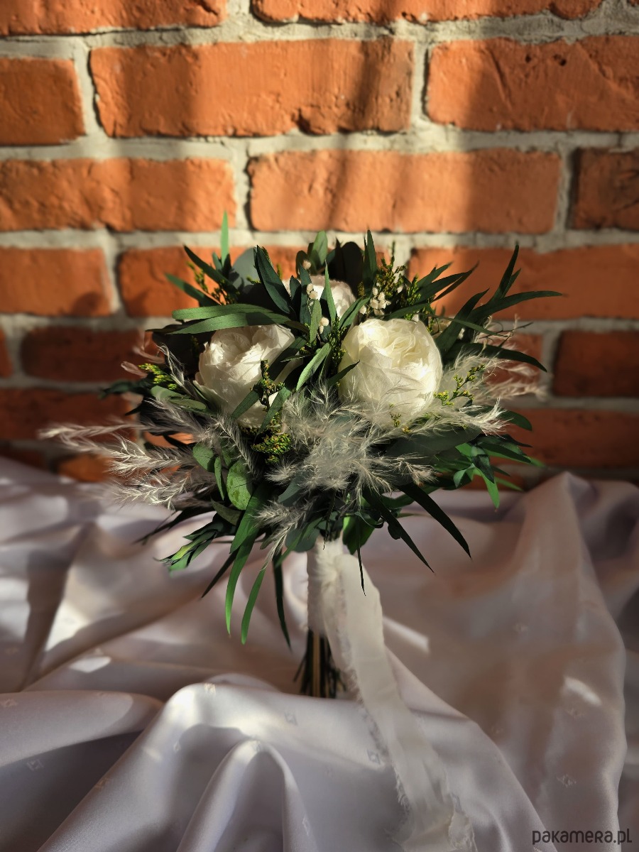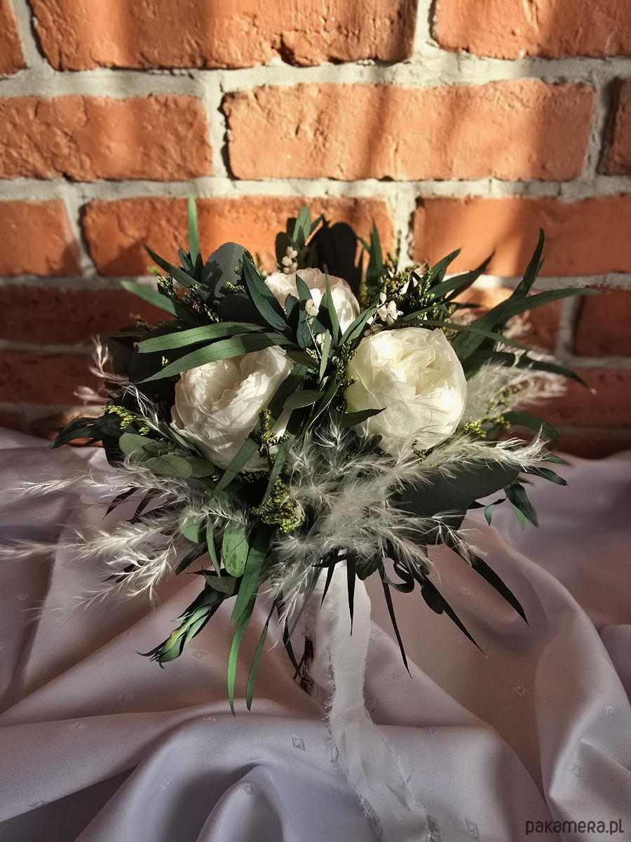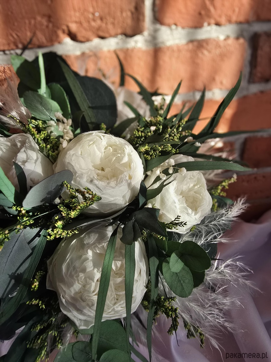 Bukiet wykonany został ze stabilizowanych białych piwoniowych róż, kilku rodzajów zielonego eukaliptusa, limonium oraz delikatnych ozdobnych traw, które nadają mu lekkości i romantycznego charakteru. Całość dopełnia elegancka, szyfonowa wstążka, podkreślając styl boho, glamour oraz klasyczną elegancję.