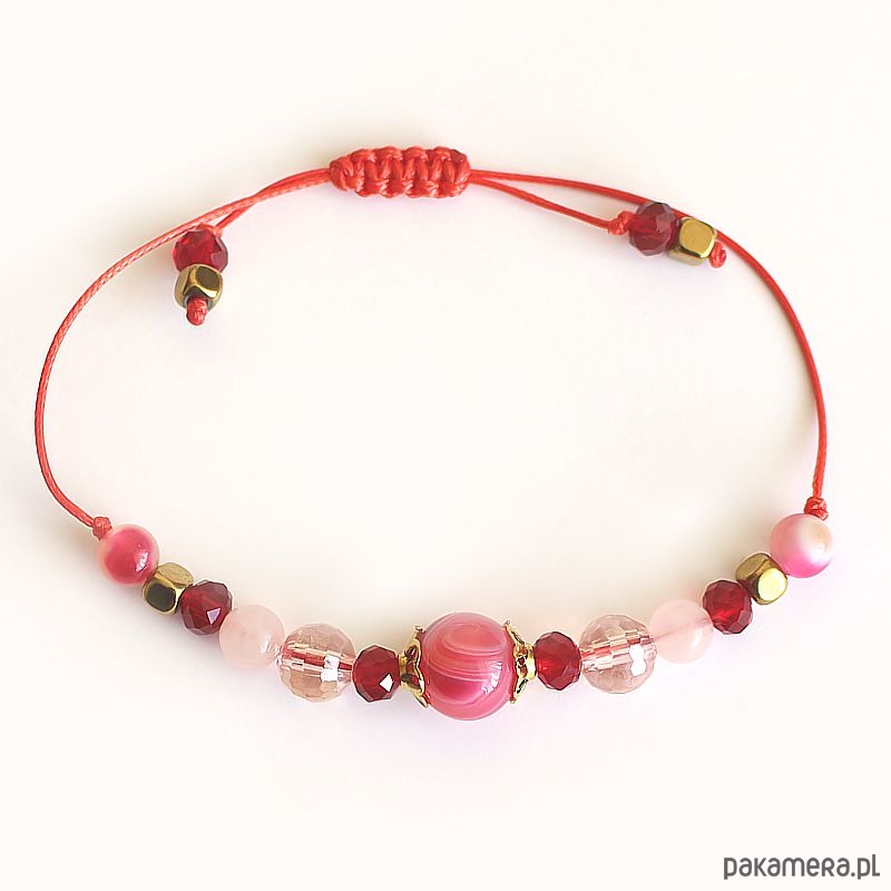 Energetyczna bransoletka wykonana techniką shamballa z agatem różowym, kwarcem różowym, rubinem i hematytem.