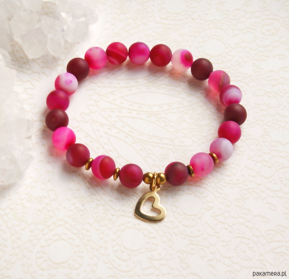 śliczna bransoletka na solidnej lince elastycznej, wykonana z pięknego agatu w odcieniach fuksji i różu (matowe kule 8mm) oraz zawieszki z POZŁACANEJ STALI SZLACHETNEJ (nie uczula) i przekładek ze złotego hematytu.
