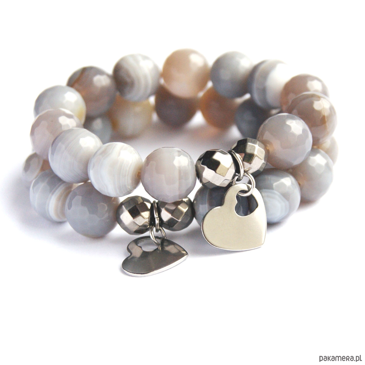 piękna, niezwykle efektowna bransoletka na solidnej lince elastycznej, wykonana z pięknego agatu w odcieniach szarości (DUUUŻE fasetowane kule 14mm), z dodatkiem 2 kul fasetowanego hematytu oraz zawieszki ze STALI SZLACHETNEJ (nie uczula, kolor nie ściera się)