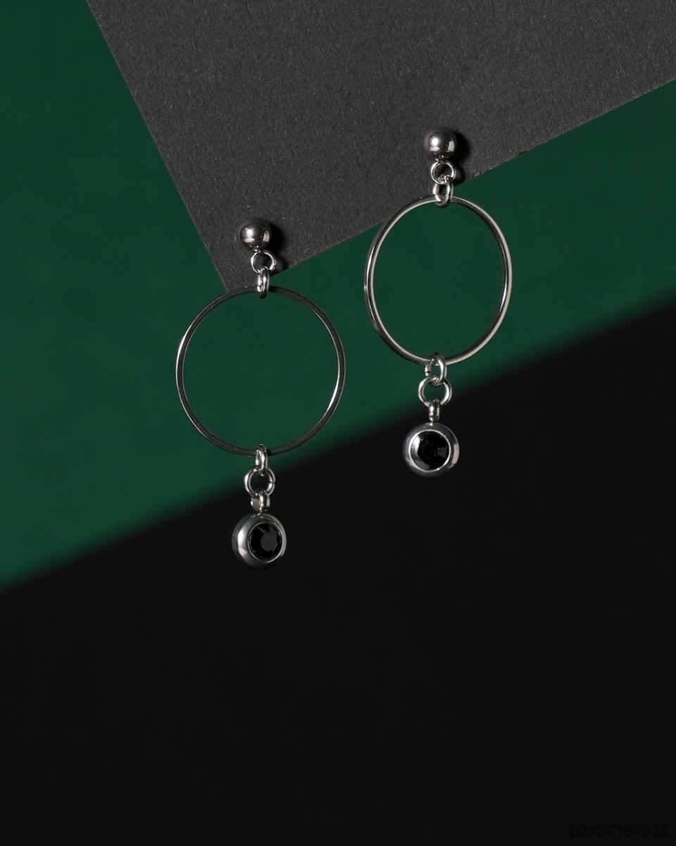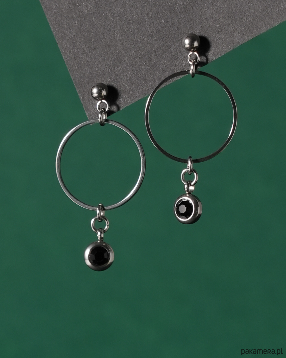 Minimalistyczne kolczyki z kółkami i drobnymi zawieszkami z czarnym KRYSZTAŁKIEM, zawieszone na klasycznych sztyftach z kulką. Prostota i elegancja.