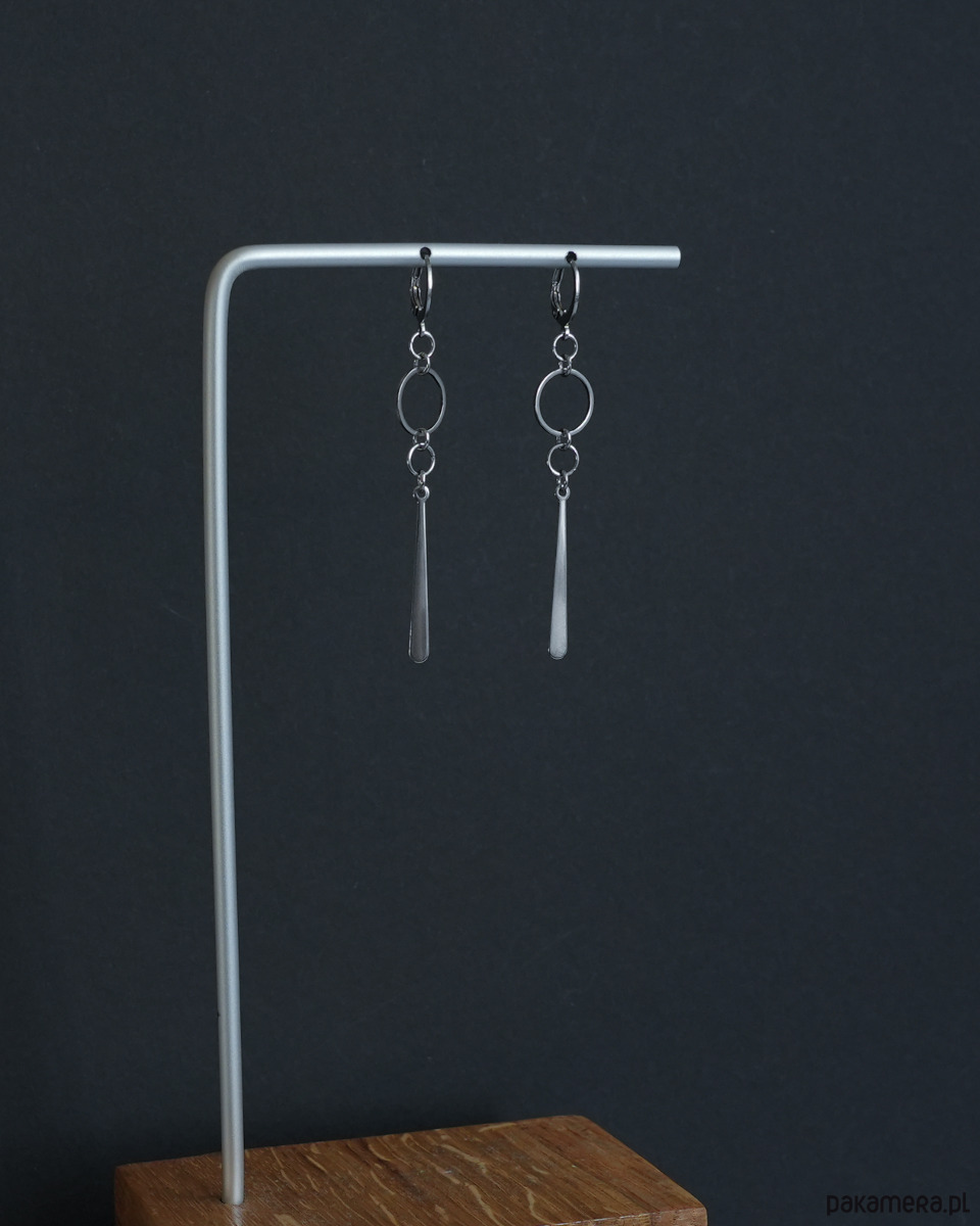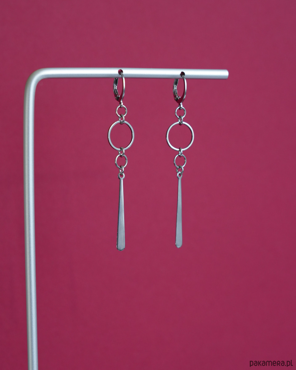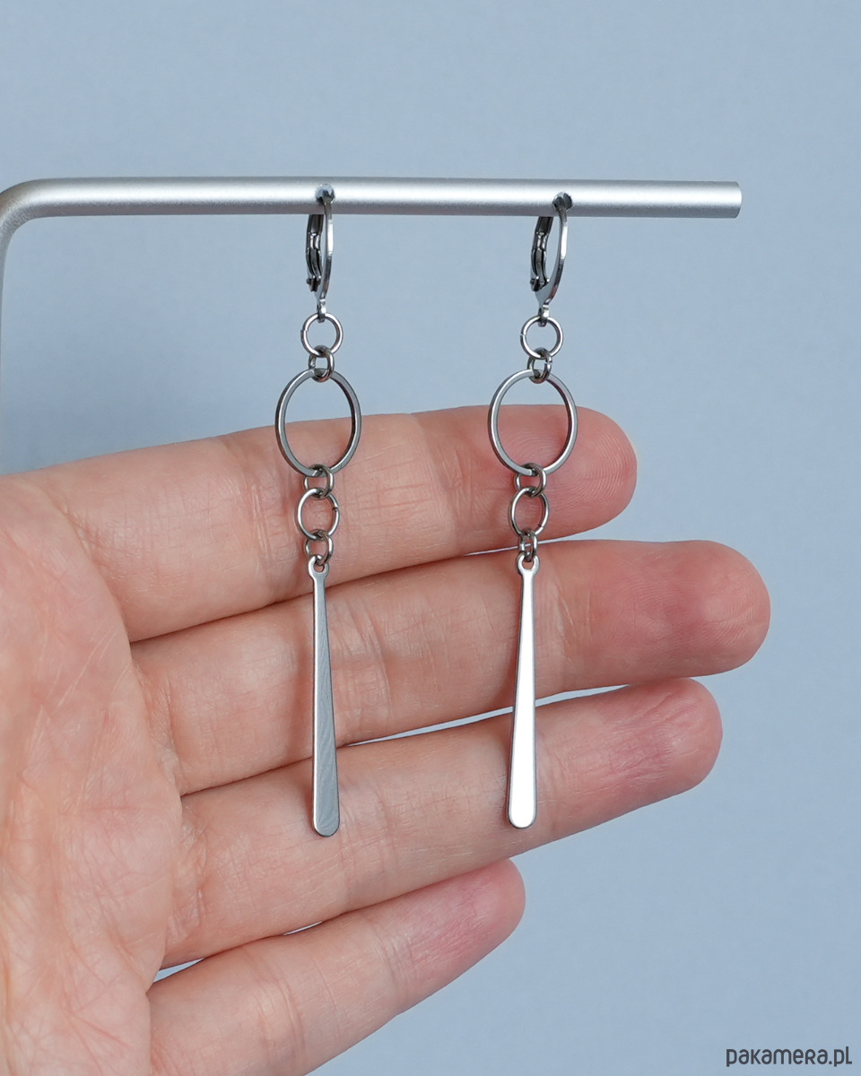 Nieduże, wiszące kolczyki w całości wykonane ze stali szlachetnej.