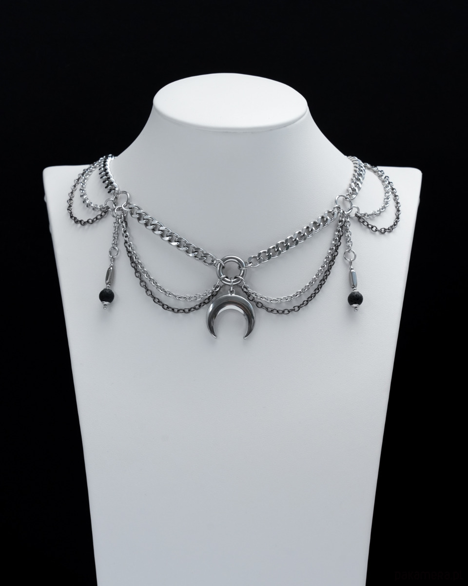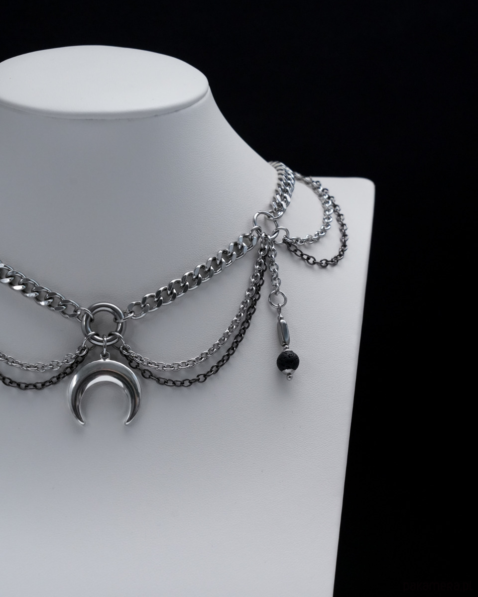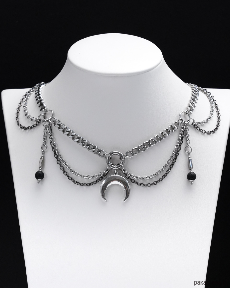 Unikatowy i oryginalny, gotycki naszyjnik (kolia) wykonany ręcznie z różnej wielkości łańcuszków i ogniwek. Głównym elementem naszyjnika jest zawieszka w kształcie LUNULI (księżyca). Po bokach towarzyszą jej dwa wiszące elementy z LAWĄ WULKANICZNĄ i HEMATYTEM. Cały naszyjnik opiera się na grubym i konkretnym łańcuszku typu "pancerka".