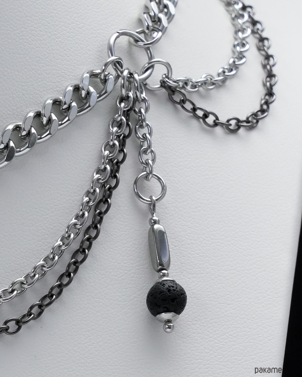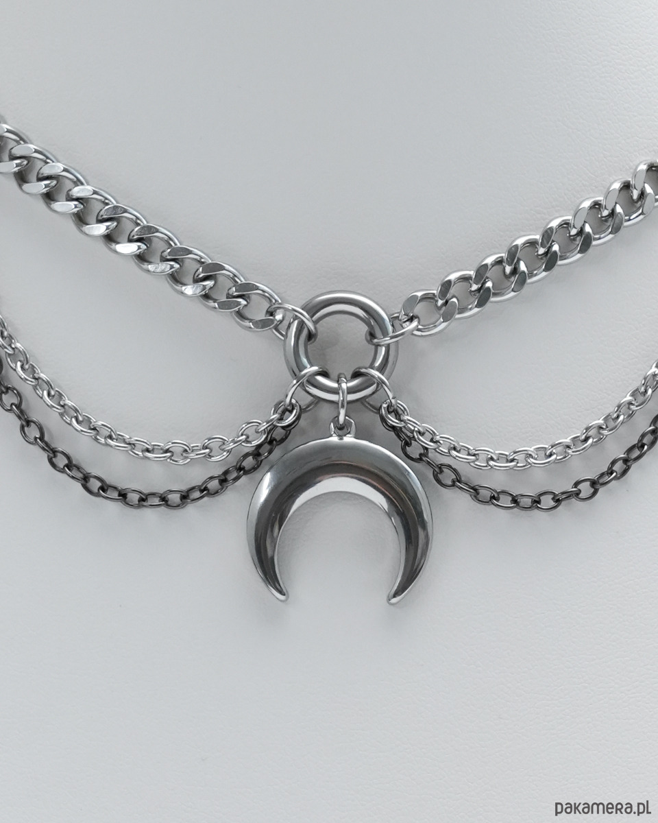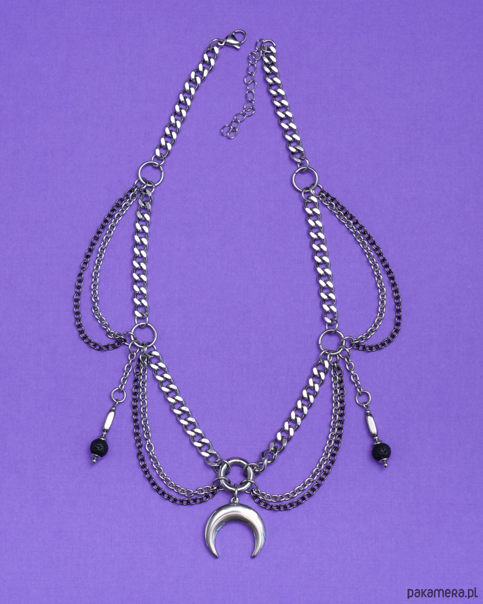 Unikatowy i oryginalny, gotycki naszyjnik (kolia) wykonany ręcznie z różnej wielkości łańcuszków i ogniwek. Głównym elementem naszyjnika jest zawieszka w kształcie LUNULI (księżyca). Po bokach towarzyszą jej dwa wiszące elementy z LAWĄ WULKANICZNĄ i HEMATYTEM. Cały naszyjnik opiera się na grubym i konkretnym łańcuszku typu "pancerka".