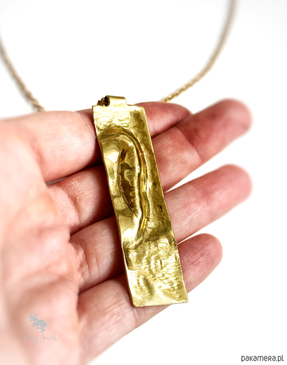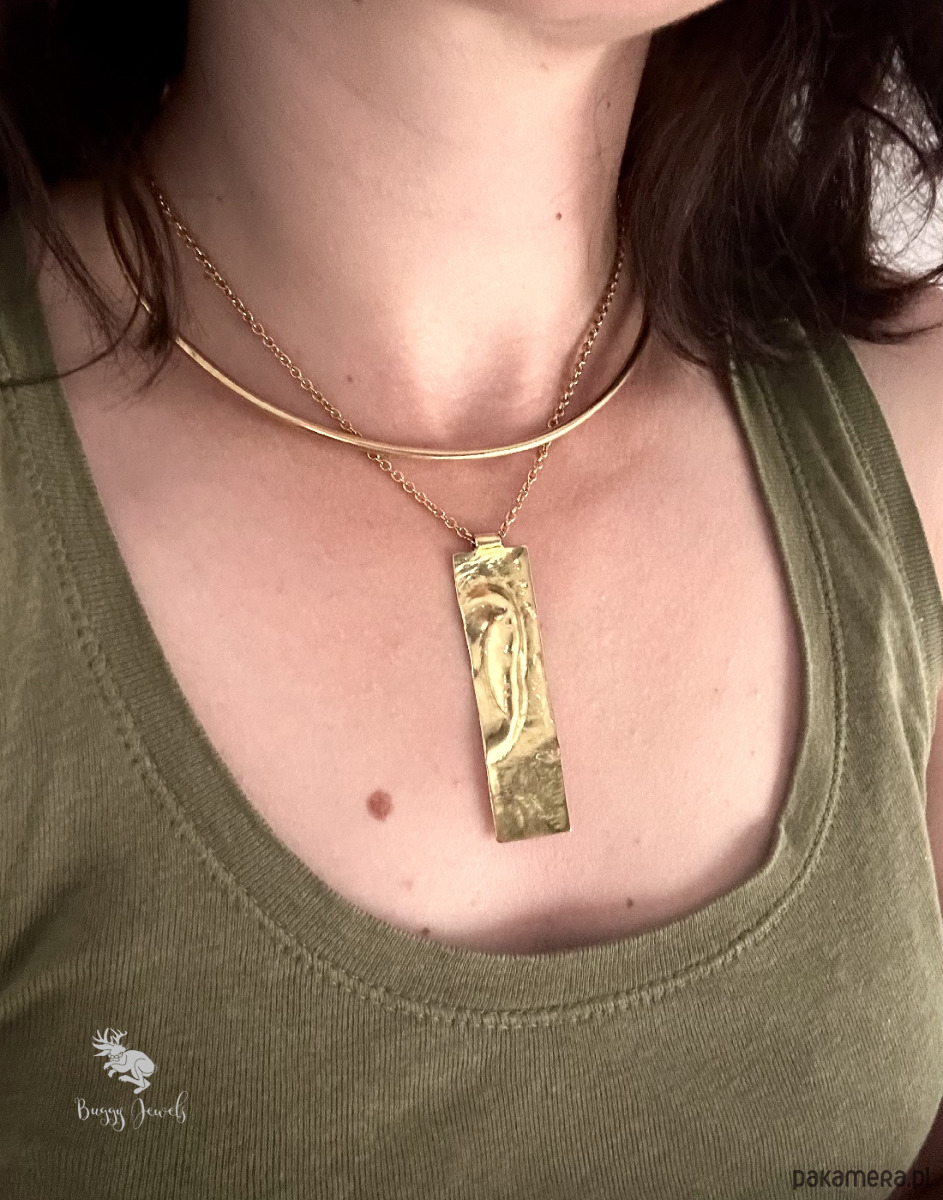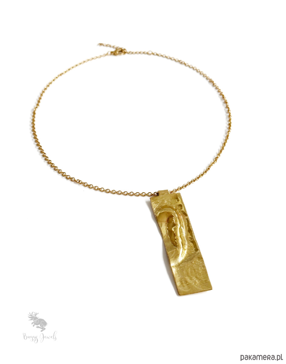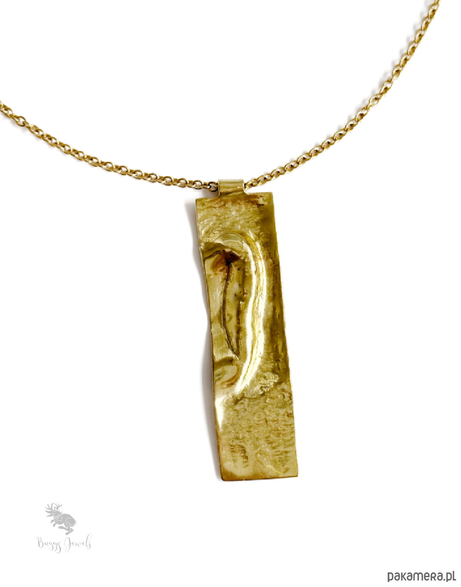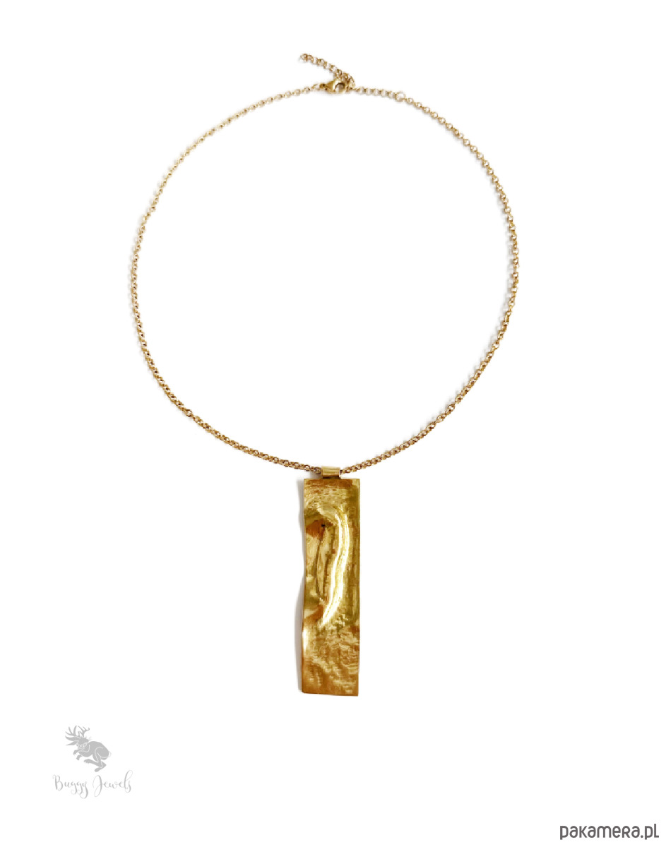 Pozłacany, stalowy łańcuszek z mosiężnym, podłużnym wisiorkiem to eleganckie połączenie starożytności i nowoczesności.