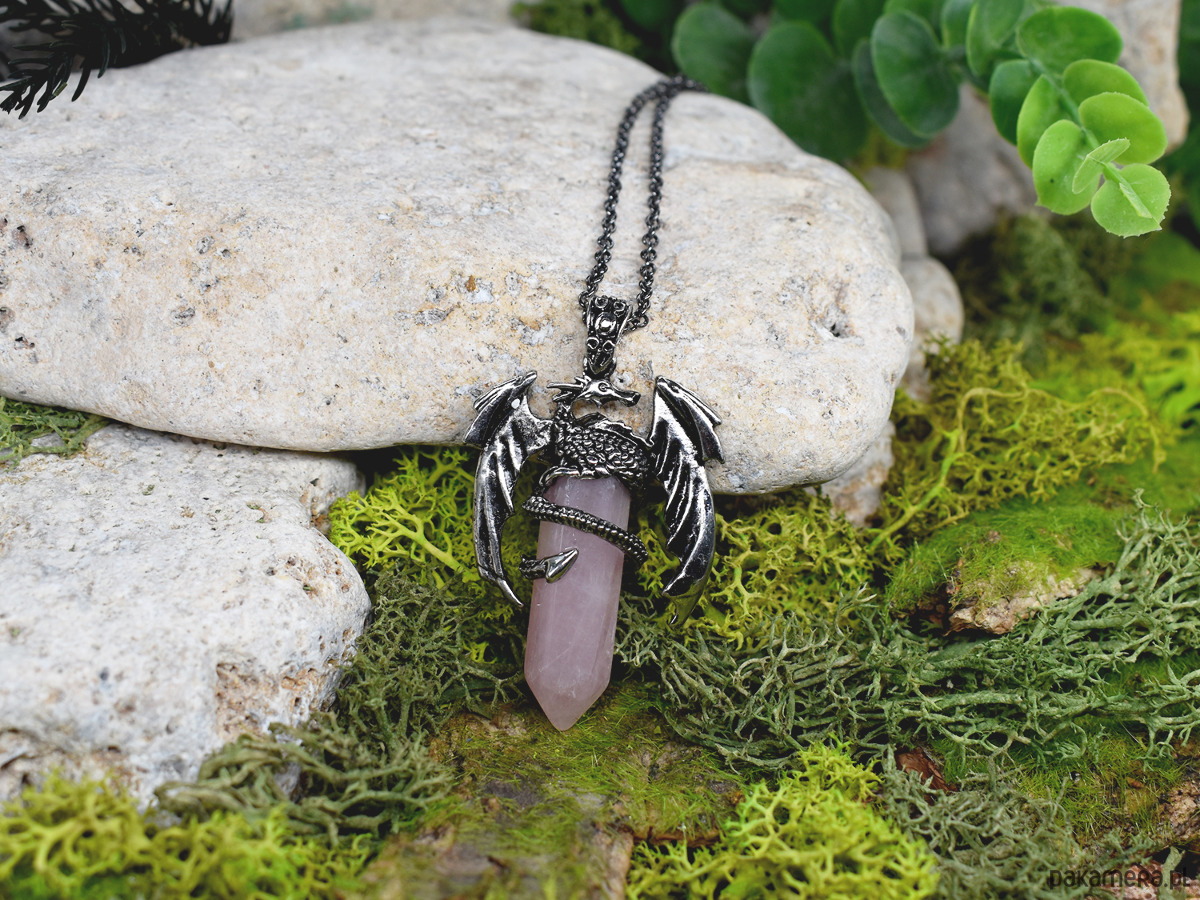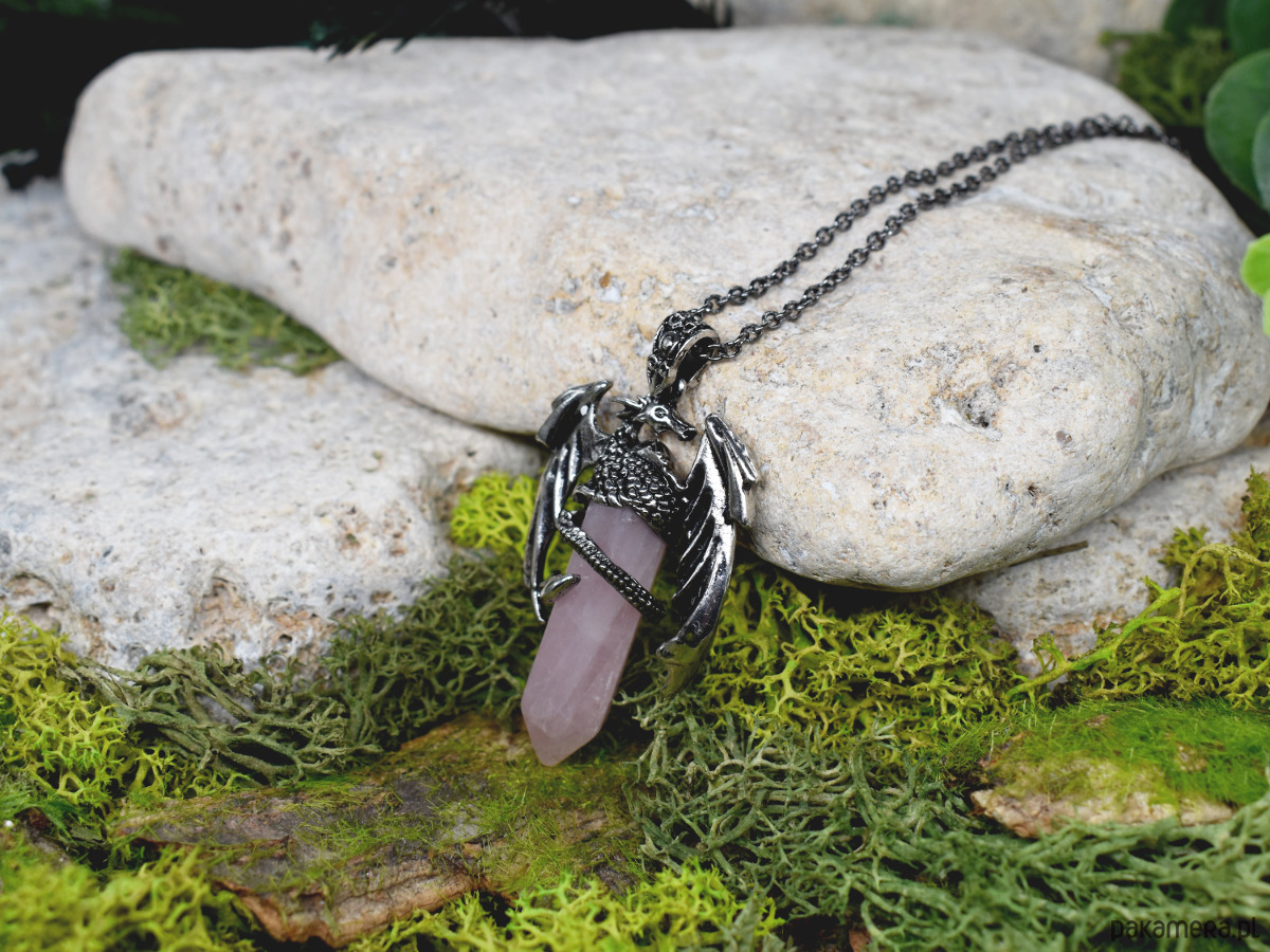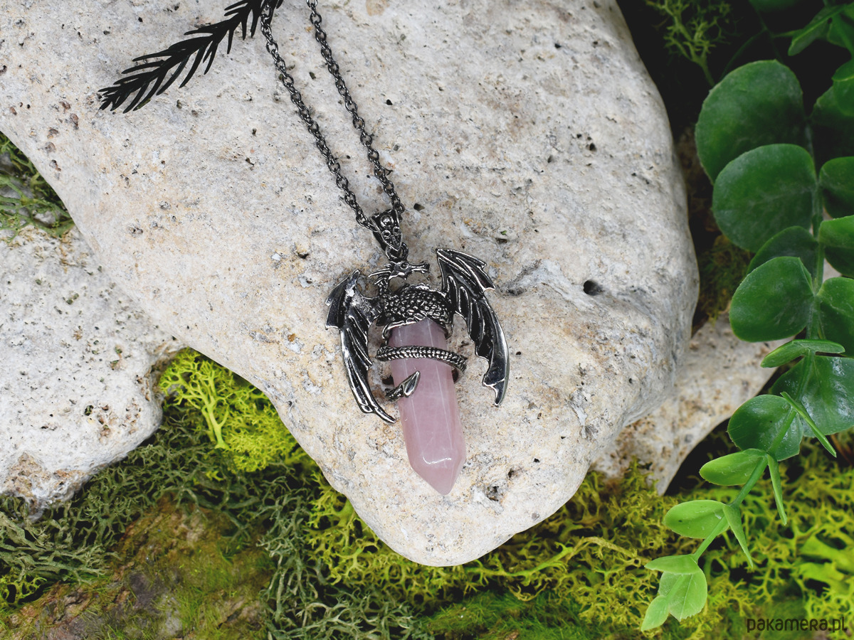 Stalowy wisiorek z różowym kwarcem / wiwerna, smok, wywerna, wiedźmin