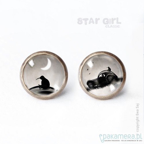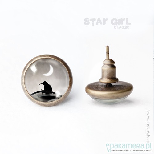 Malutkie, pełne czaru, oryginalne, zaczarowane, romantyczne kolczyki-wkręty . Miniaturki moich grafik zmniejszone do wymiaru 10 mm Ukryłam je niczym maleńki sekret pod szklaną kopułą organicznego szkiełka. Sztyft w kolorze starego złota z idealnie dopasowaną zatyczką. Średnica kolczyka 12 mm.