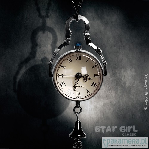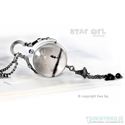 Sferyczny naszyjnik, kula z zegarkiem. Niczym w magicznej kuli zamknęłam w naszyjniku z jednej strony miniaturkę mojej grafiki, z drugiej zegarek. Baza naszyjnika w kolorze antycznego srebra. Średnica 25 mm. Naszyjnik ozdobiony jest dzwoneczkiem i 4 mm czarnymi onyksami. Zegarek posiada mechanizm kwarcowy, ma wymienialną baterię. Długość łańcuszka 70 cm. Zrób sobie prezent! Wolny od niklu i ołowiu - antyalergiczny.