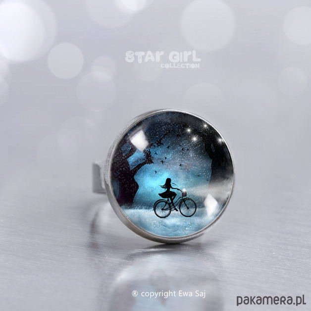 Oryginalny, zaczarowany, romantyczny pierścionek. Miniaturka mojej grafiki ukryta pod szklaną kopułą organicznego szkiełka. Pierścionek wykonany z estetycznego metalu w kolorze ciemnego srebra, wielkość regulowana średnica graficznej miniatury 20 mm. Wolny od niklu i ołowiu - antyalergiczny. Projekt autorski - wszystkie prawa zastrzeżone.