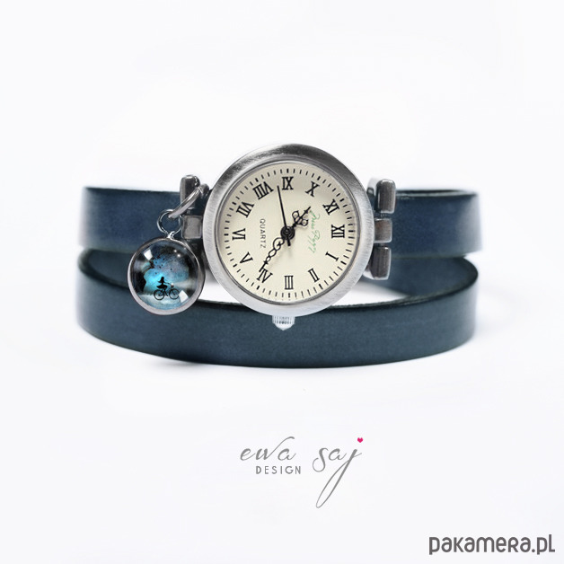 Pasek w kolorze granatowym, szeroki na 10 mm dwukrotnie owija nadgarstek. Wielkość tarczy zegarka 25 mm, średnica charmsa 12 mm. Zapięcie, charms i zegarek w kolorze antycznego złota. Tarcza sygnowana autorskim podpisem. Istnieje możliwość dostosowania długości paska do każdego nadgarstka. Pod zakupem wpisz obwód własnego nadgarstka (ciasno zmierzonego).