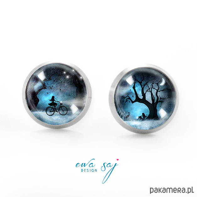 Malutkie, pełne czaru, oryginalne, zaczarowane, romantyczne kolczyki-wkręty. Miniaturki moich grafik zmniejszone do wymiaru 10 mm ukryłam pod szklaną kopułą organicznego szkiełka. Baza w kolorze srebra wykonana ze stali nierdzewnej. Średnica kolczyka 12 mm. Wolne od niklu i ołowiu - antyalergiczne. copyright Ewa Saj. All Right reserved.