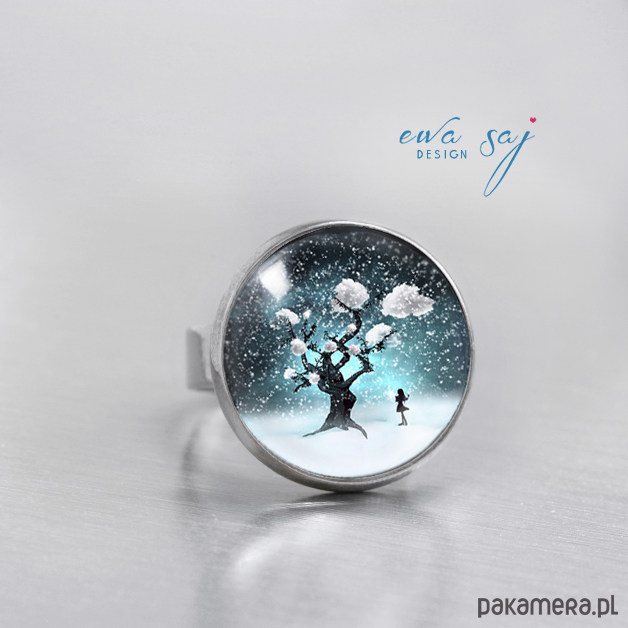 Oryginalny, zaczarowany, romantyczny pierścionek. Miniaturka mojej grafiki ukryta pod szklaną kopułą organicznego szkiełka. Pierścionek wykonany z estetycznego metalu w kolorze ciemnego srebra, wielkość regulowana średnica graficznej miniatury 20 mm. Wolny od niklu i ołowiu - antyalergiczny. Projekt autorski - wszystkie prawa zastrzeżone.