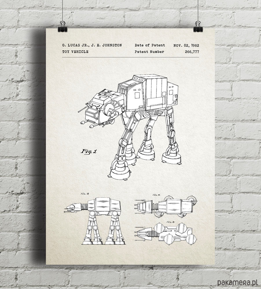 Plakat z reprodukcją patentu na pojazd bojowy AT-AT, zwany też Imperial Walker - symbol Marynarki Imperialnej z uniwersum Gwiezdnych Wojen (Star Wars). Patent zaprojektowany przez G.Lucas'a Jr., J.E.Johnston'a. Patent o numerze 266,777 został udzielony w 1982 roku przez Urząd Patentów i Znaków Towarowych Stanów Zjednoczonych.
