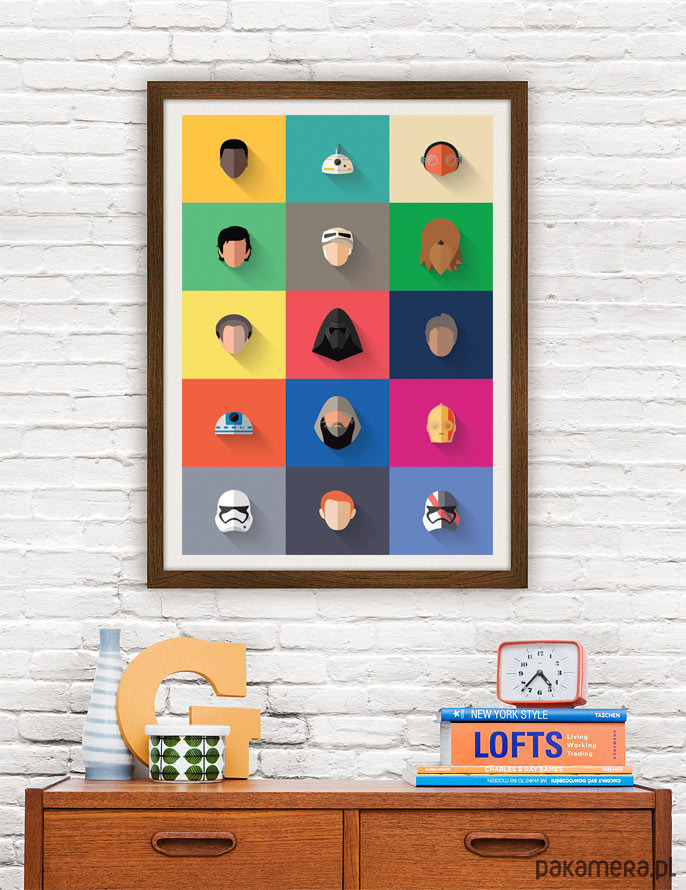 Plakat z autorską grafiką inspirowaną filmem "Gwiezdne Wojny: Przebudzenie Mocy" (Star Wars: The Force Awakens), reż. J.J.Abrams. 15 ikon przedstawia główne postacie z nowych epizodów kultowej serii.