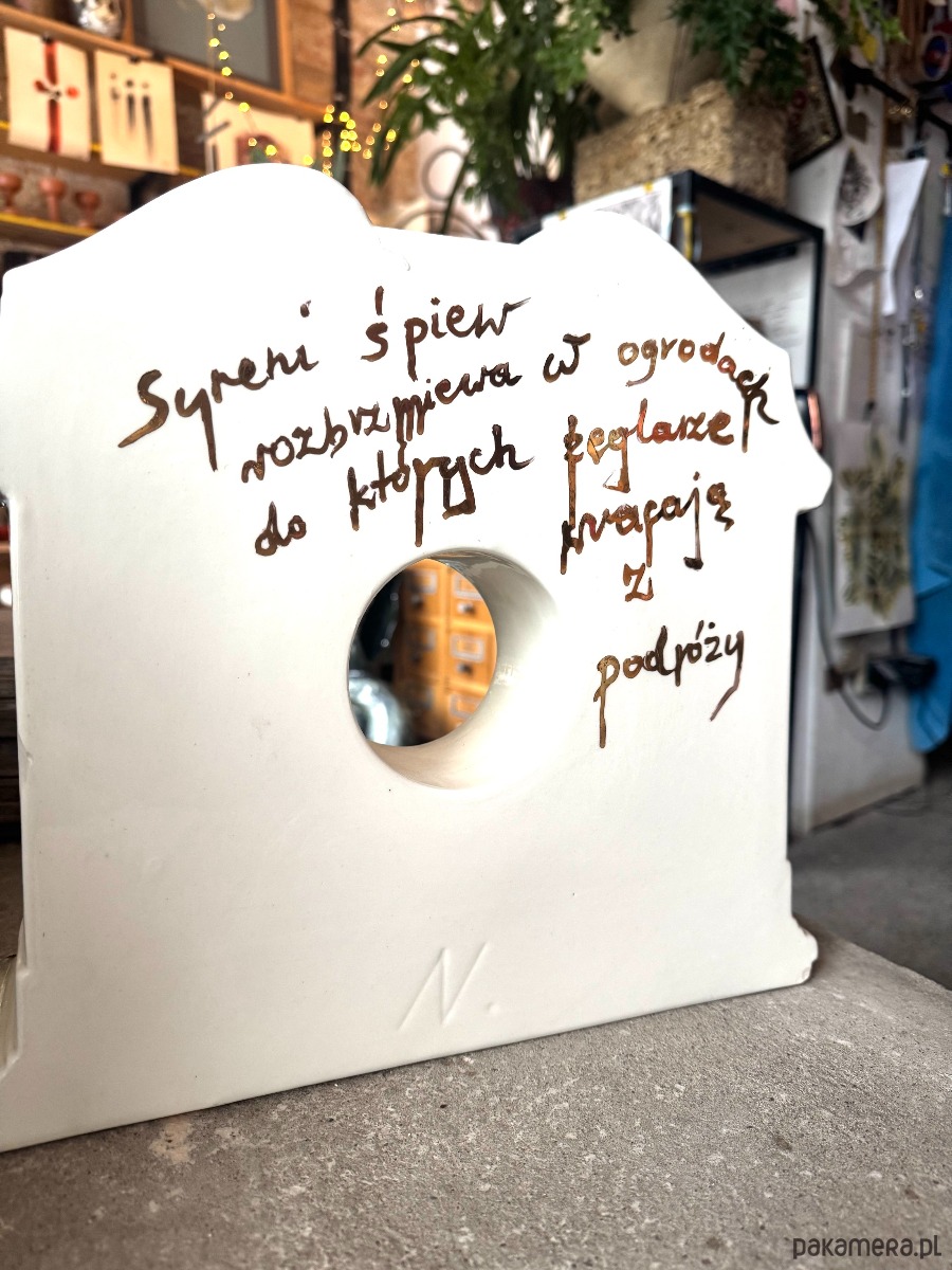 Na odwrocie zegara znajduje się dodatkowy tekst odnoszący pracę do nazwy pracowni Ogród Syrenich Śpiewów, domykający narrację o miejscu poza czasem, gdzie liczy się obecność, uważność i spotkanie.