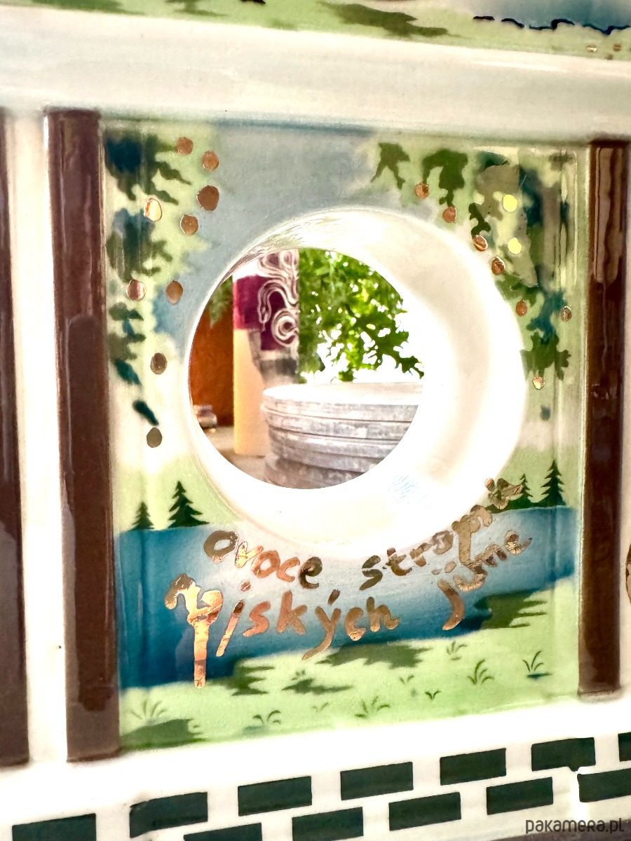 Ilustracje na tarczy zostały ręcznie przekształcone w rajski ogród: pojawiają się węże, owoce, roślinność i złoty, malowany ręcznie napis w języku czeskim: