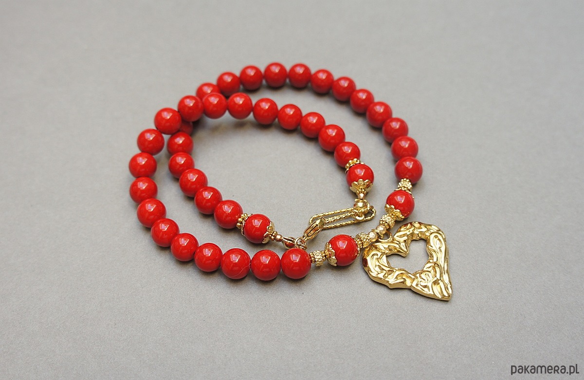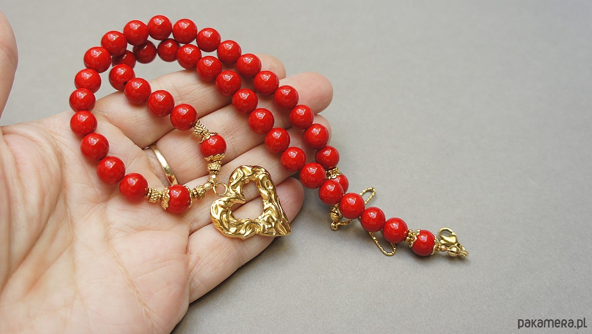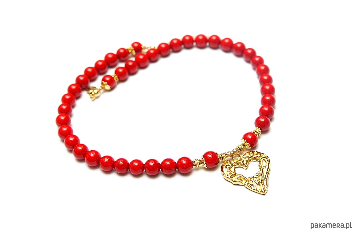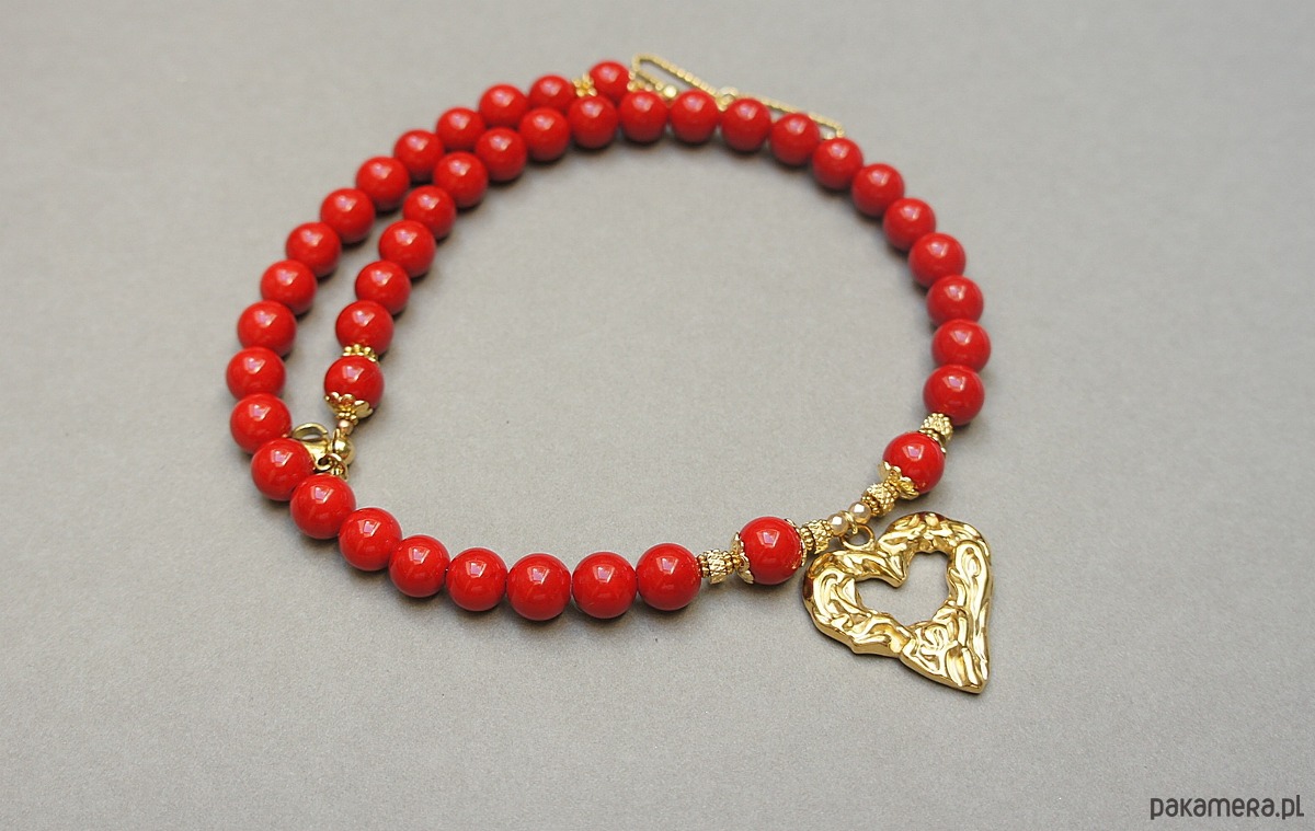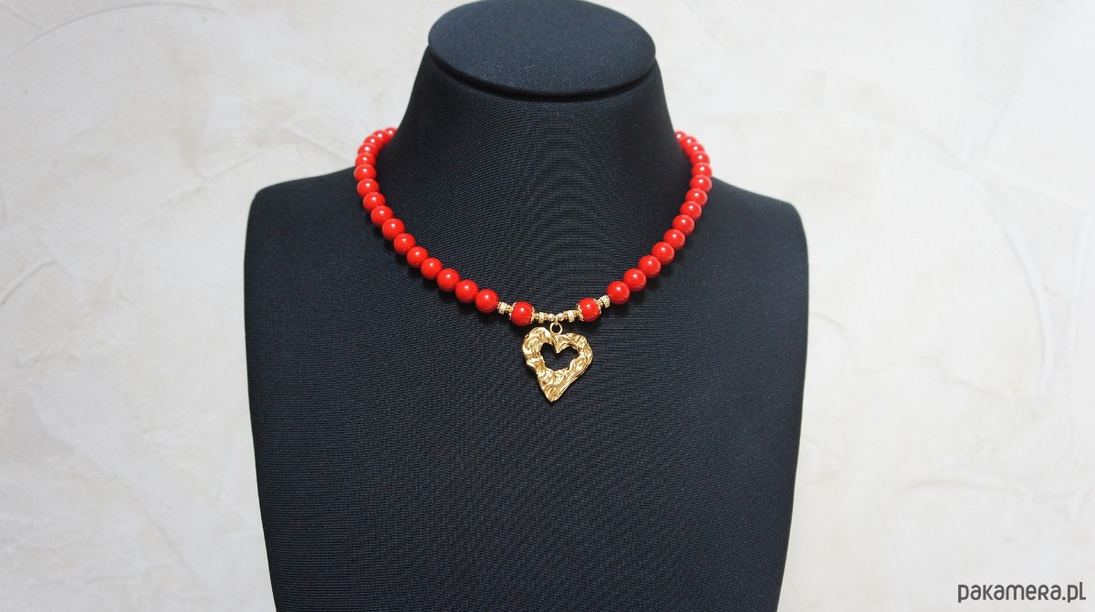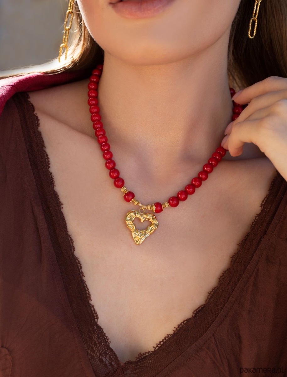 Krótki naszyjnik wykonany w całości z pozłacanej stali szlachetnej oraz kamieni - marmur [8mm], hematyt fasetowany, platerowany o matowej powłoce [3mm] oraz dużej zawieszki w kształcie gniecionego serca [20 x 25mm]. Naszyjnik o długości ok. 42cm. Biżuteria ozdobnie zapakowana.