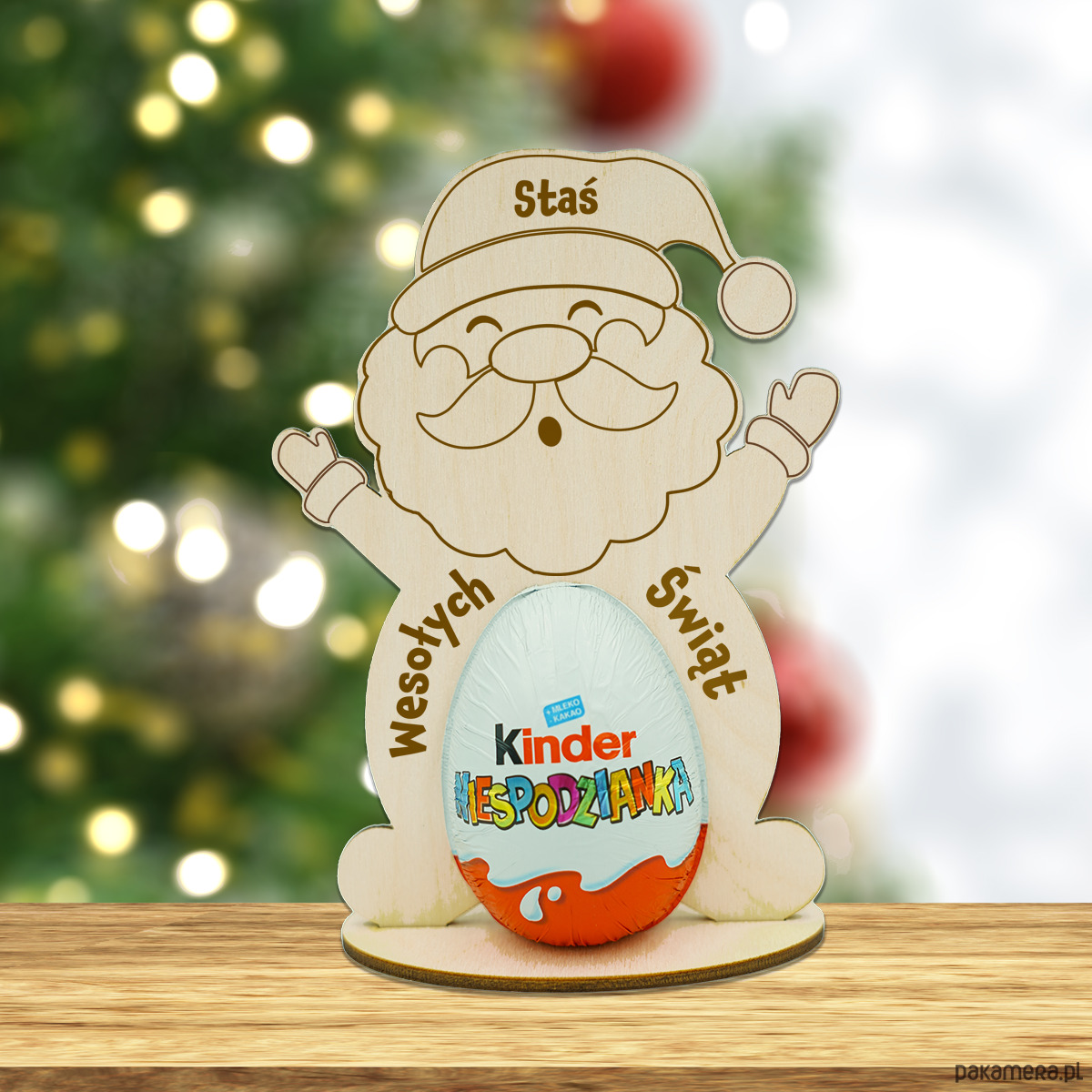 Drewniany Mikołaj z imieniem to oryginalna i pełna uroku statuetka świąteczna, która idealnie sprawdzi się jako prezent na Mikołajki. Wykonana z wysokiej jakości drewna, przedstawia Świętego Mikołaja z miejscem na jajko Kinder Niespodziankę. Połączenie klasycznego wizerunku Mikołaja z popularnym jajkiem niespodzianką tworzy wyjątkową dekorację, która z pewnością wywoła uśmiech na twarzy obdarowanej osoby.