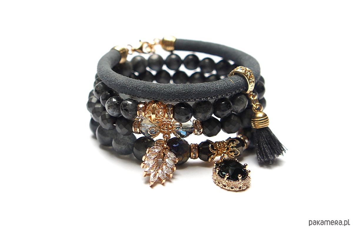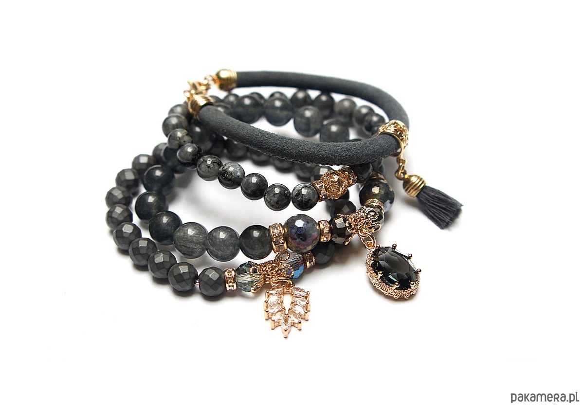 Komplet czterech bransoletek wykonanych z naturalnych kamieni - jadeity szkliste [10mm], larvikit fasetowany, platerowany [10mm],larvikit [8mm], jadeit [8mm], hematyt fasetowany [8mm], kryształków fasetowanych [8mm], rzemienia z naturalnej skóry, chwostu, zawieszki wysadzanej cyrkoniami, zawieszki ze szkła w okuciu oraz elementów metalowych w kolorze złotym. Bransoletki pasują na nadgarstek 16 - 17cm. Biżuteria ozdobnie zapakowana