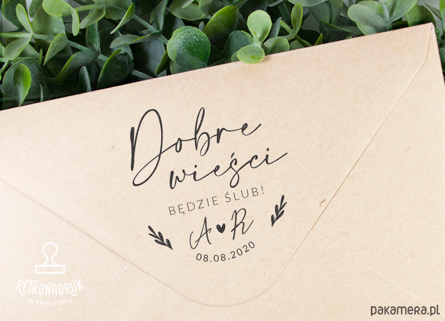 Stempel ślubny z napisem "Dobre wieści" do personalizacji inicjałami Pary Młodej i datą ślubu. Stemple, pieczątki ślubne to świetny pomysł na oznaczenie kopert, dekoracji i innej papeterii ślubnej, to również unikalna pamiątka dla Pary Młodej.