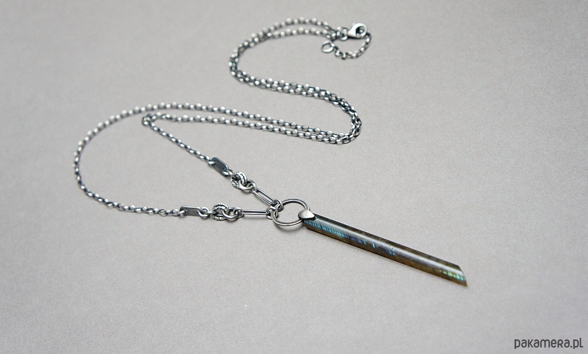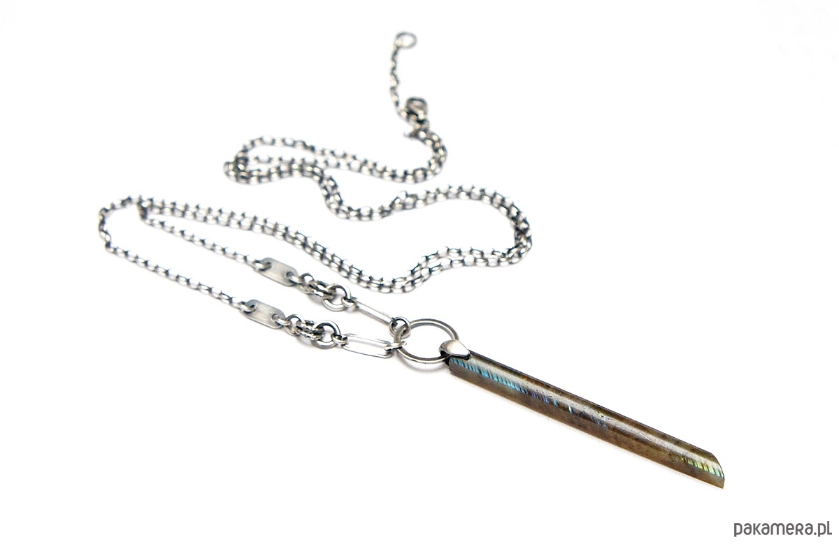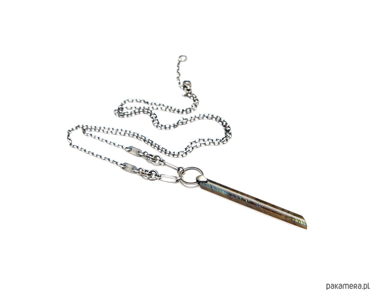 Naszyjnik wykonany ze srebra [pr. 925] w połączeniu z patyczkiem labradorytu [57mm] . Srebro oksydowane i przetarte. Całkowita długość naszyjnika 70cm. Biżuteria ozdobnie zapakowana.
