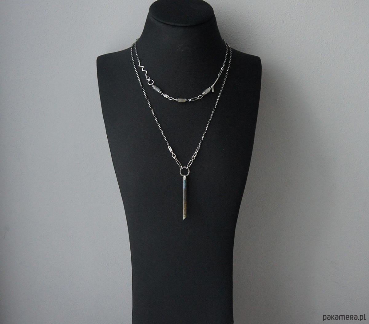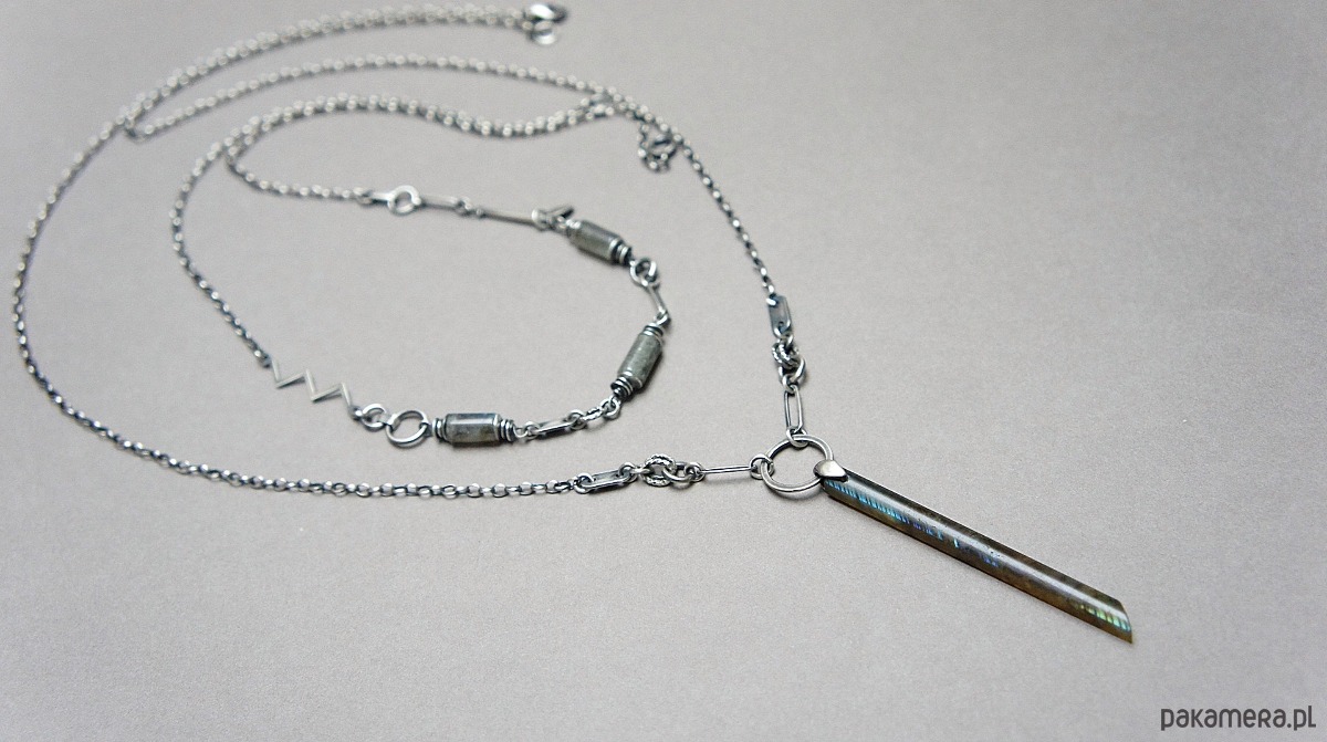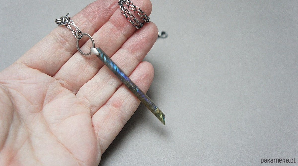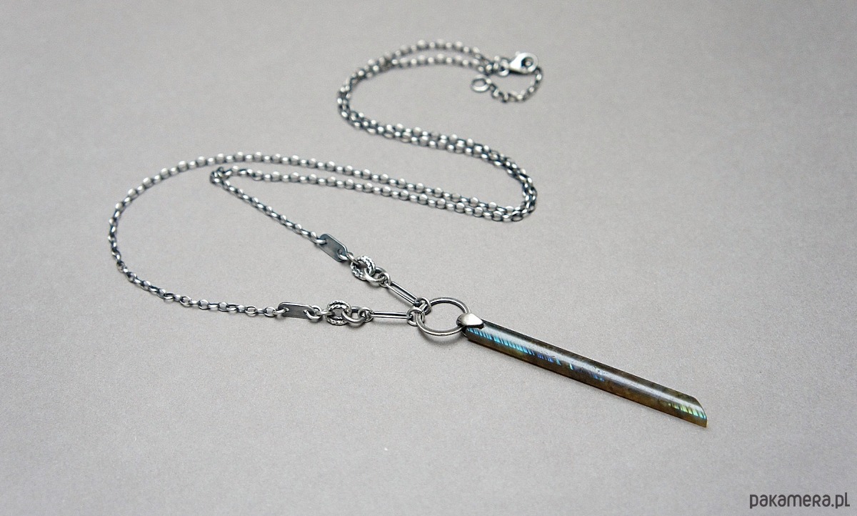 Naszyjnik wykonany ze srebra [pr. 925] w połączeniu z patyczkiem labradorytu [57mm] . Srebro oksydowane i przetarte. Całkowita długość naszyjnika 70cm. Biżuteria ozdobnie zapakowana.