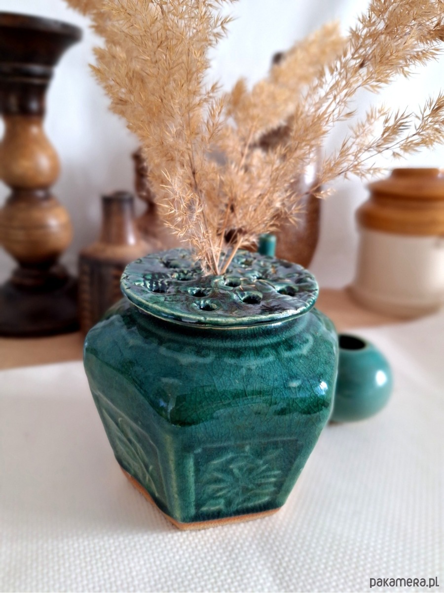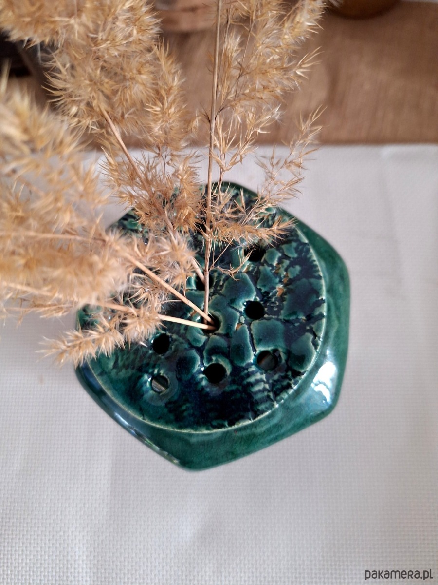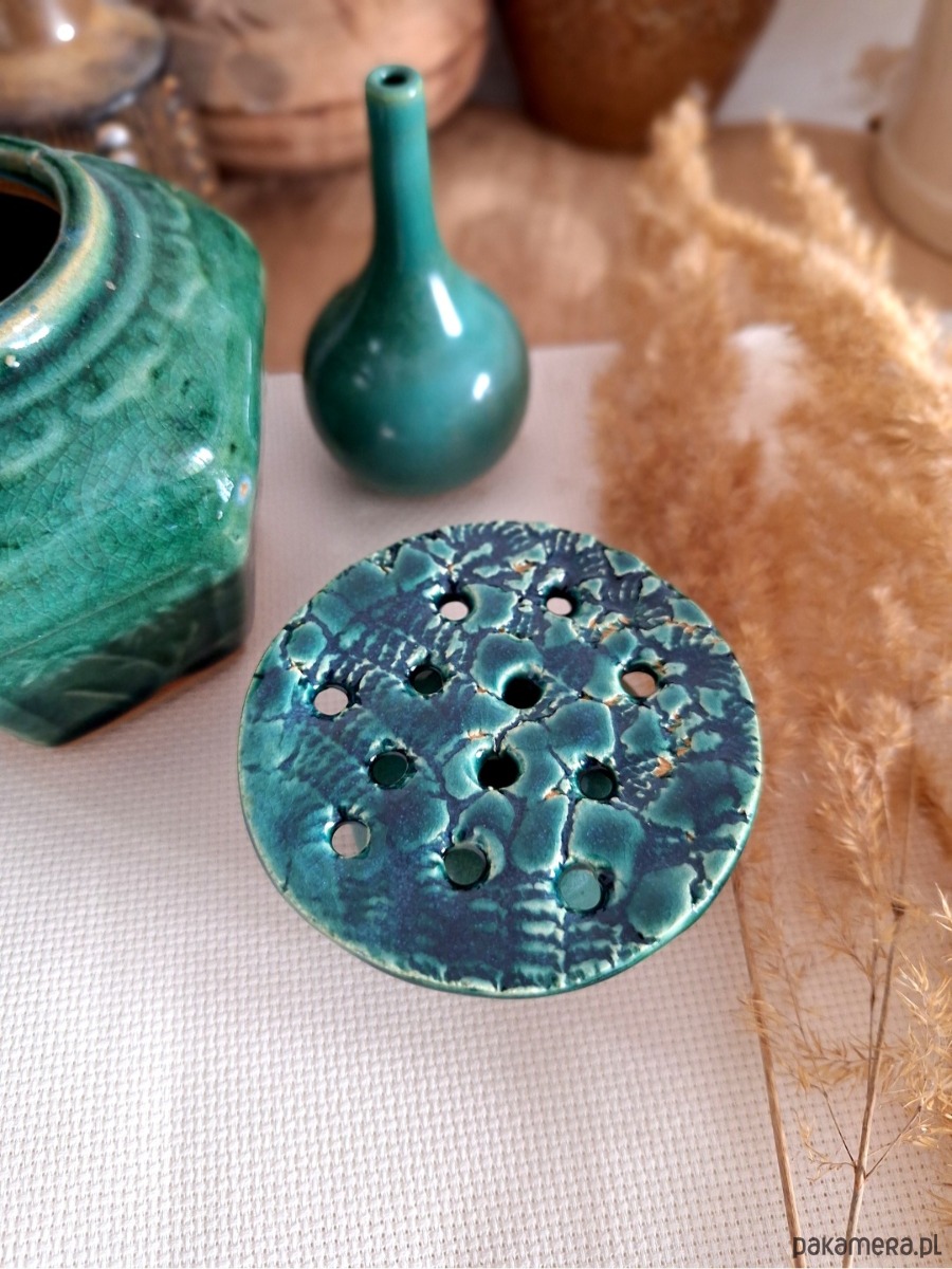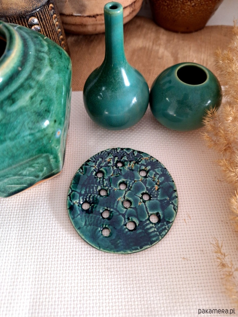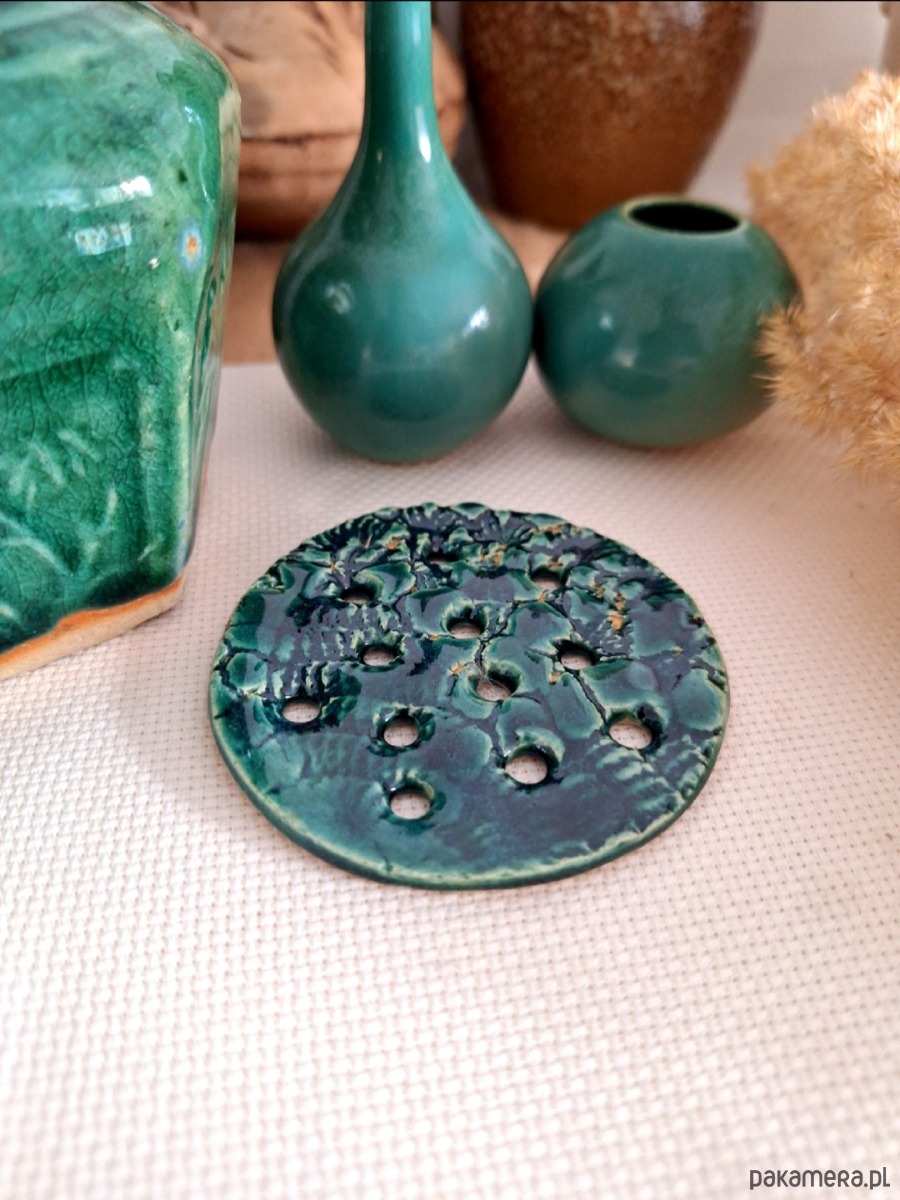 Ceramiczna okrągła podstawka z otworami. Podstawka służy do układania kompozycji kwiatowych lub roślinnych zapewniając większą stabilność bukietu. Podstawkę umieszcza sie na wazonie z wodą, następnie łodygi kwiatowe wkłada się w otwory w podstawce, dzięki temu mamy kontrolę nad ułożeniem rośliny. Ręcznie wykonana dekoracja, szkliwiona zielonym błyszaczącym szkliwem ze zdobioną powierzchnią. Przydatna ozdoba dla miłośnika bukietów i kompozycji roślinnych.