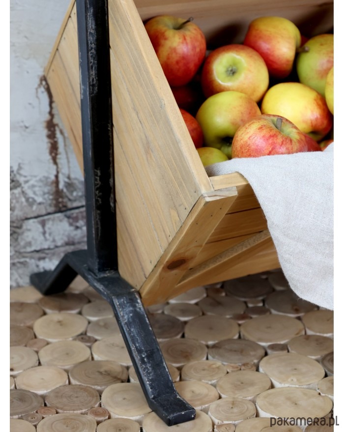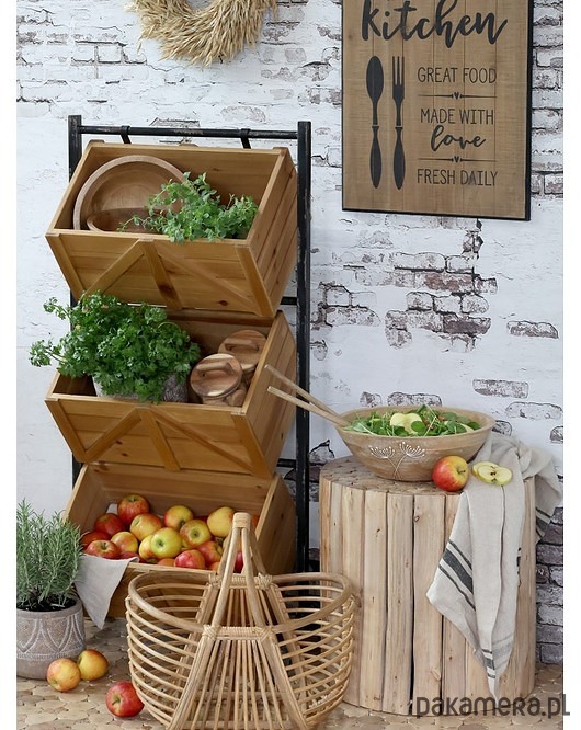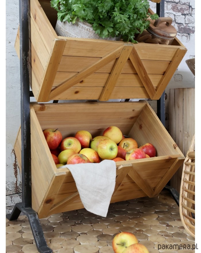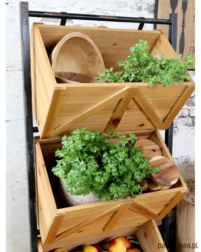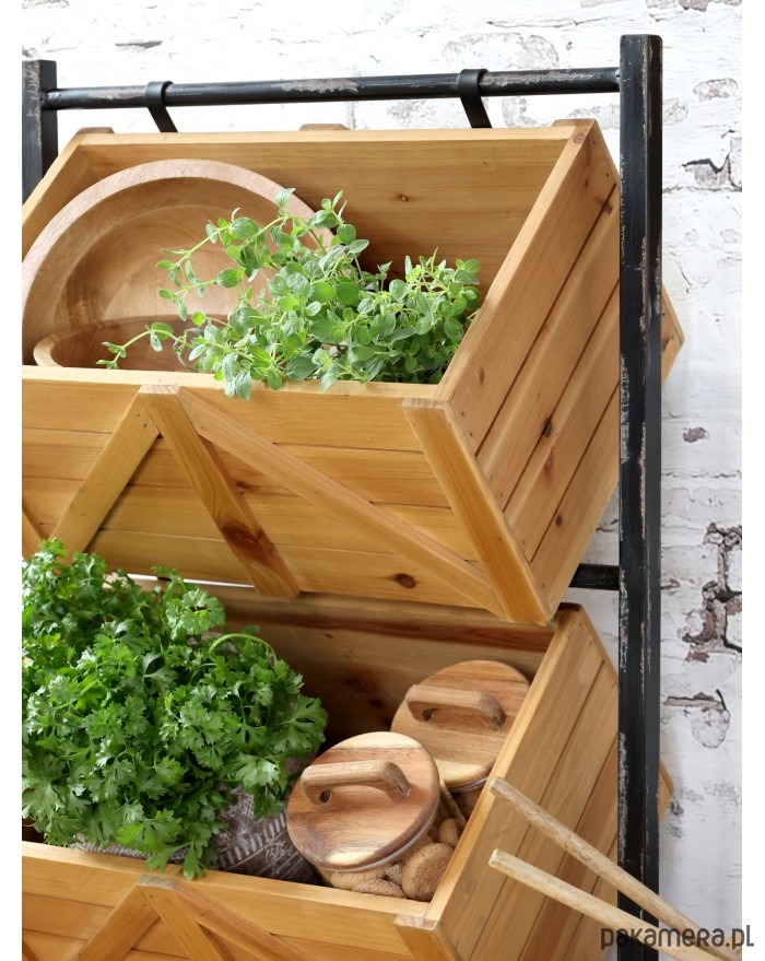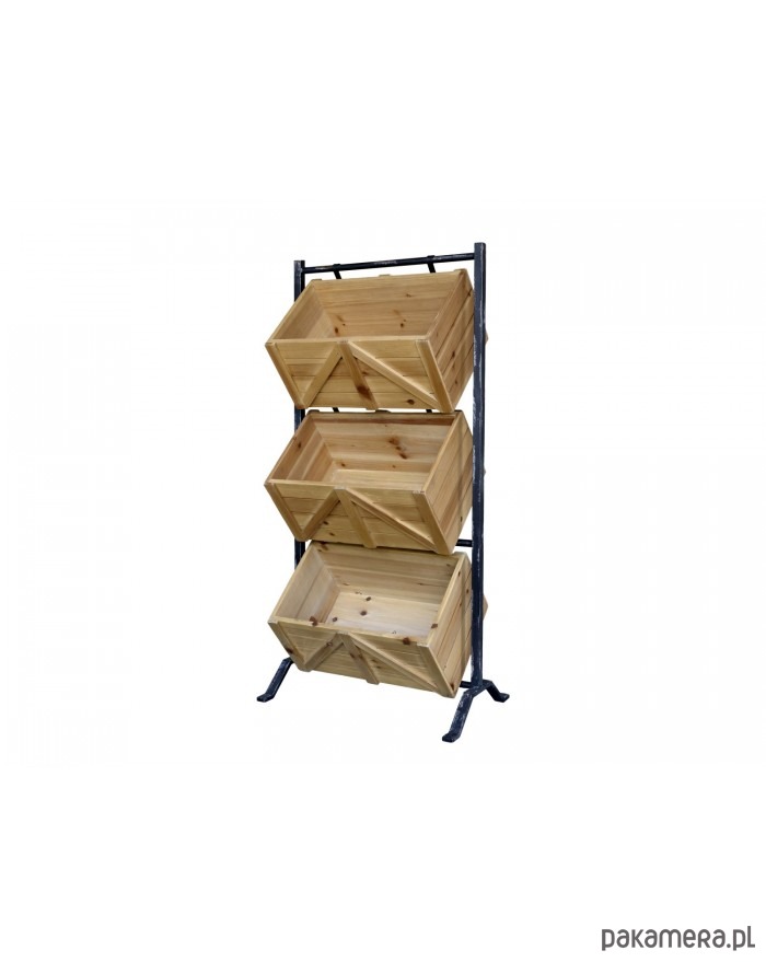 Rewelacyjny stojak wykonany z metalu malowanego proszkowo na kolor czarny. Posiada trzy solidne, jodłowe skrzynie, które są zawieszane. Idealny na owoce, warzywa czy zioła.