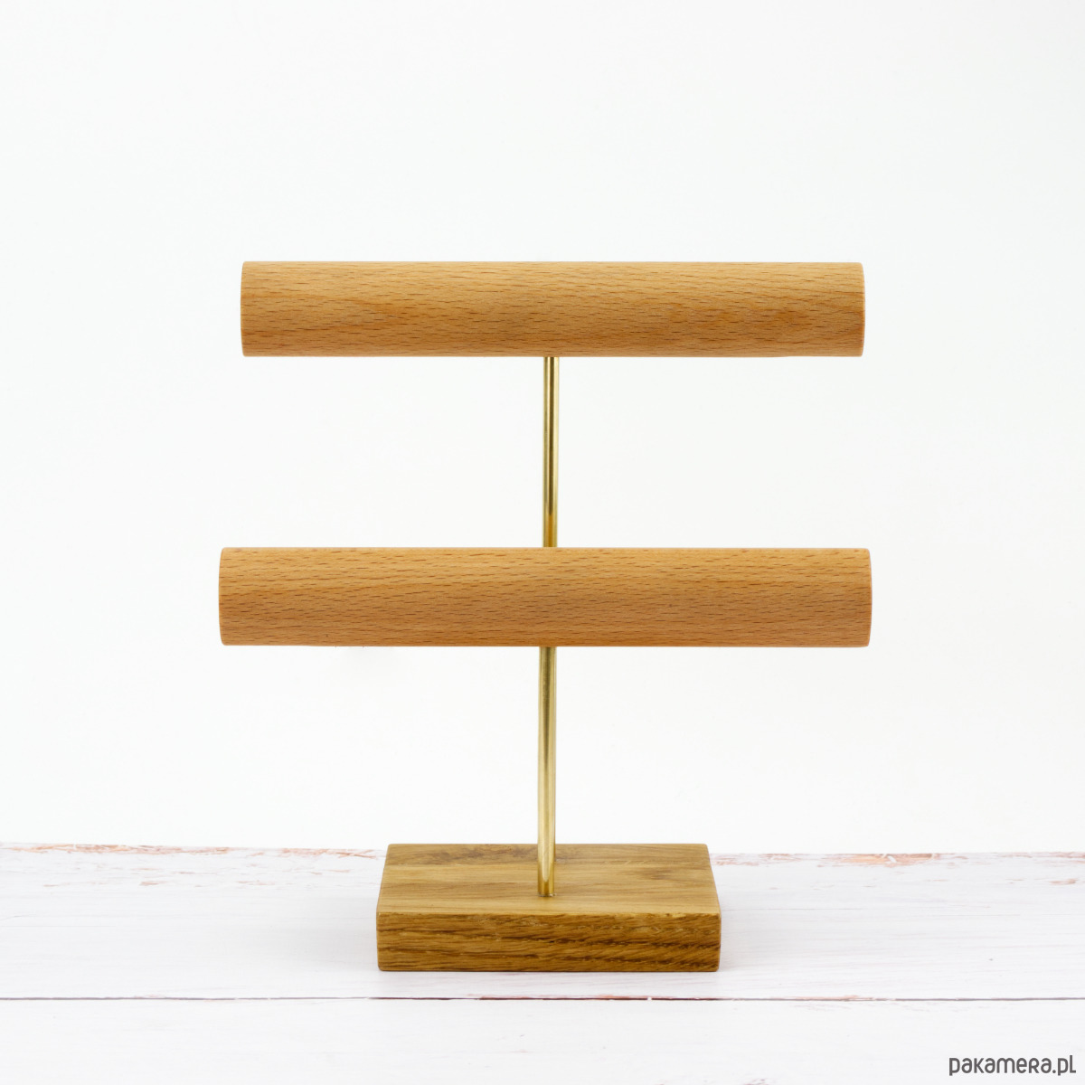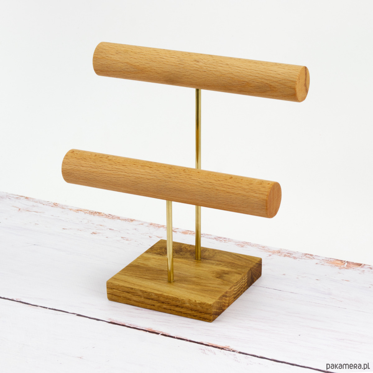 Stojak na bransoletki i łańcuszki został stworzony w polskiej pracowni hand made. Z miłości do drewna oraz niepowtarzalności dodatków powstał stojak na biżuterię do sklepu lub do domu. Podstawa wykonana ze specjalnie wyselekcjonowanego dębu została zaimpregnowana olejem dając naturalny wygląd dębu. Jej rozmiar wynosi 10 × 10 cm. Na mosiężnym stelażu zostały umieszczone dwa bukowe wałki o długości 19cm, w kolorze naturalnym. To idealny produkt do utrzymania porządku w biżuterii lub wyeksponowania ciekawych wzorów biżuterii na stoisku jubilerskim.