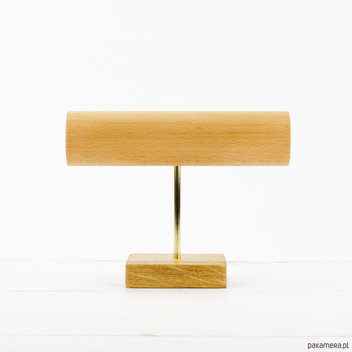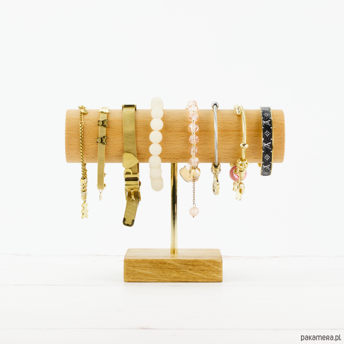 Wybierz ten unikalny stojak na bransoletki, jeśli cenisz minimalistyczne elementy. Drewniany wieszak osadzony na mosiężnym stelażu z drewnianą podstawą to gwarancja satysfakcji. Jest łatwy w utrzymaniu w czystości i umożliwia powieszenie około 8-10 bransoletek.
