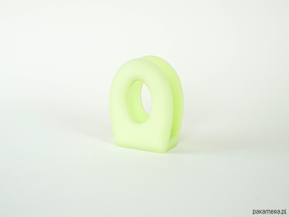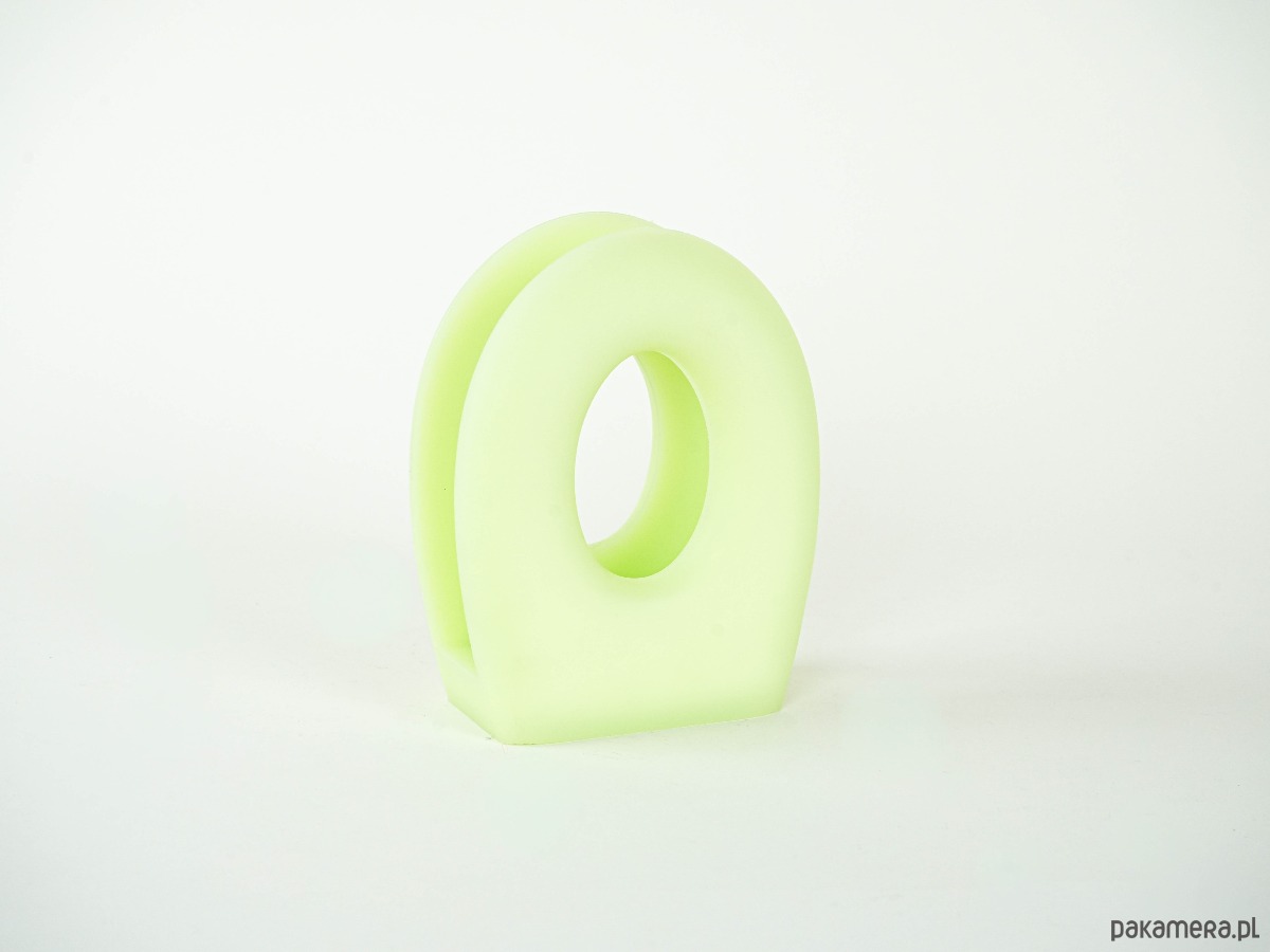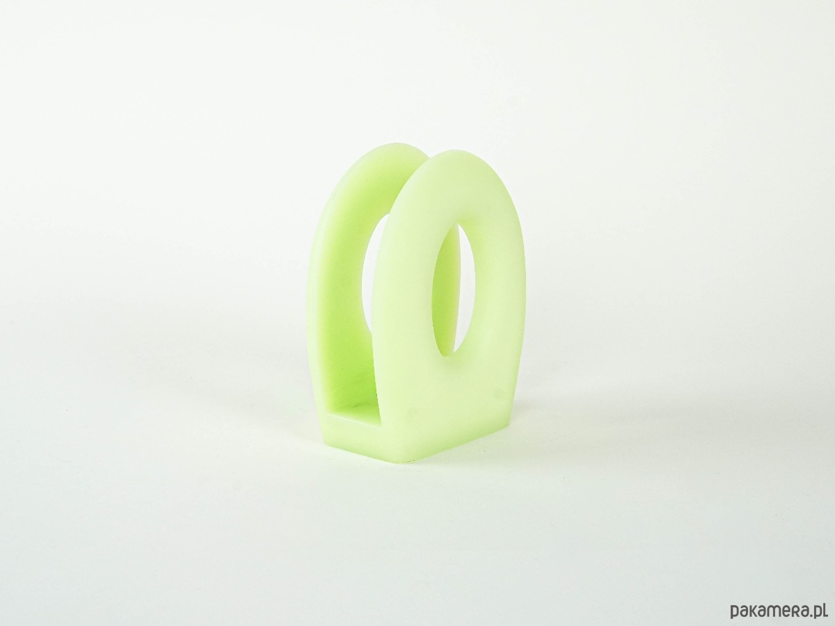 Oryginalny stojak marki Fratelli Guzzini, wykonany z wysokiej jakości tworzywa sztucznego w matowym, seledynowym kolorze. Forma geometryczna z dużym centralnym otworem, typowa dla włoskiego designu drugiej połowy XX wieku. Może pełnić funkcję stojaka na gazety, serwetki lub chusteczki.
