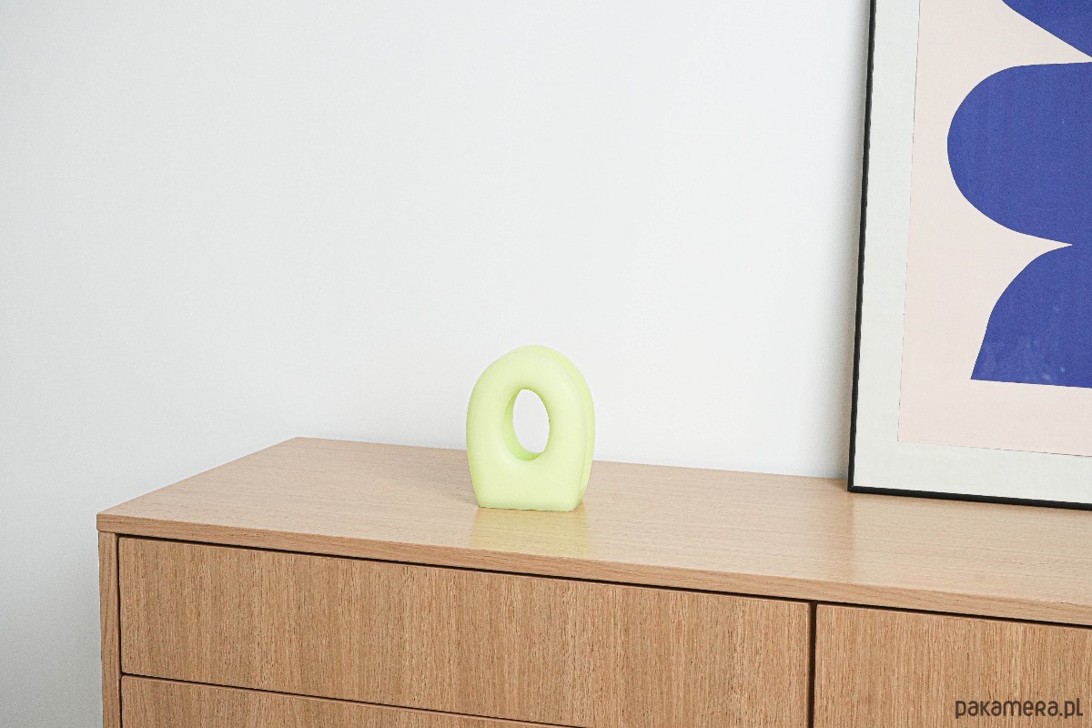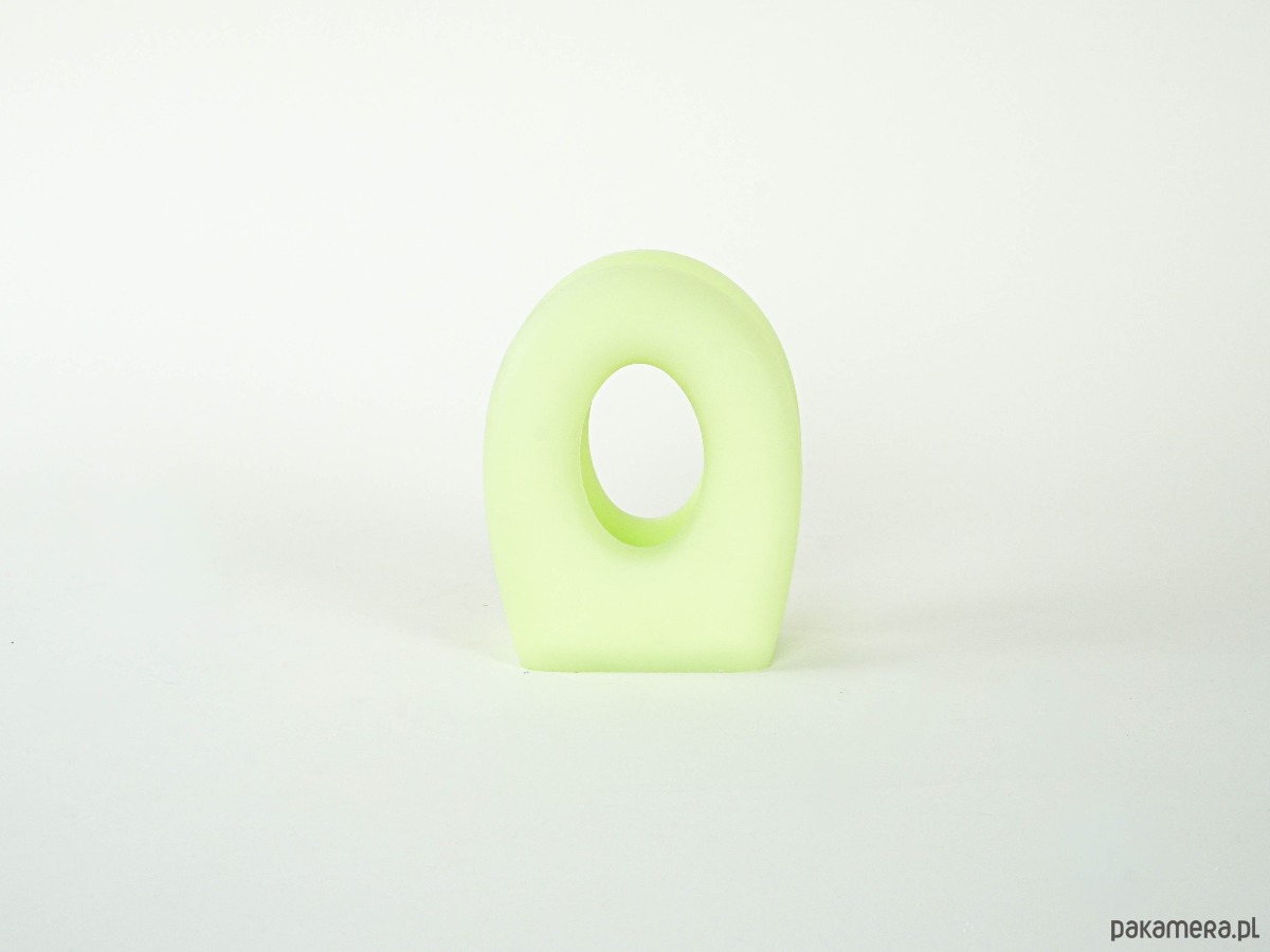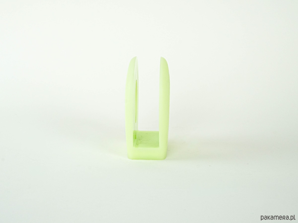 Oryginalny stojak marki Fratelli Guzzini, wykonany z wysokiej jakości tworzywa sztucznego w matowym, seledynowym kolorze. Forma geometryczna z dużym centralnym otworem, typowa dla włoskiego designu drugiej połowy XX wieku. Może pełnić funkcję stojaka na gazety, serwetki lub chusteczki.